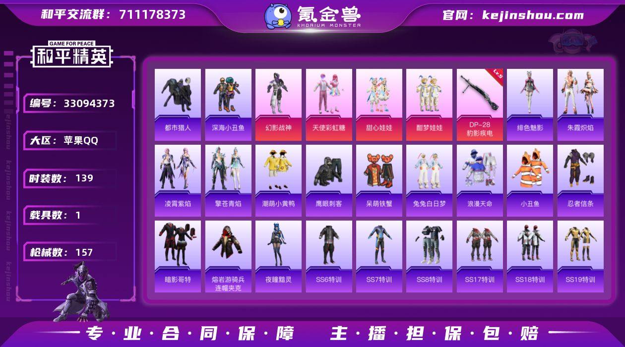 苹果 手Q-4粉装-3特效枪-1载具-1粉色飞行器-45324热力值-8王牌印记-139套装-157枪皮【热门品类】:套装-浪漫天命,套装-都市猎人,套装-深海小丑鱼,套装-小丑鱼,套装-忍者信条,套装-潮萌小黄鸭,套装-暗影哥特,熔岩游骑兵连帽夹克【粉色套装】:粉装-幻影战神,粉装-天使彩虹糖,粉装-甜心娃娃,粉装-酣梦娃娃【粉色枪皮等级】:Mk14-福马献瑞(五级),DP-28-豹影疾电(五级),PKM-萌骑夺宝(五级)【粉色载具】:法拉利Roma(纽博格林银)【粉色枪皮】:Mk14-福马献瑞,DP-28-豹影疾电,PKM-萌骑夺宝【粉色降落伞】:心之恋语降落伞,甜心娃娃降落伞,异瞳寒姬降落伞,炫彩糖果降落伞,鸢尾珑雾降落伞【稀有套装】:角色-X,套装-马上来财,套装-暮夜私语,套装-迅捷龙虾,角色-夜瞳黯灵,套装-朱霞炽焰,套装-凌霄紫焰,套装-擎苍青焰,角色-绯色魅影,套装-雨过天青,套装-红釉青花【稀有枪皮】:AKM-奇异狩猎者,AKM-彩虹符号,AKM-影袭,AKM-环太平洋,AKM-萌趣颜团子,AKM-霓虹街区,AKM-龙的传人,M16A4-红色方程式,M16A4-蓝色火焰,SCAR-L-炫彩节奏,SCAR-L-红色方程式,SCAR-L-龙宫之主,SCAR-L-冷漠罗丽,M416-紫翼圣骑,M416-红色方程式,M416-蓝色火焰,GROZA-异...