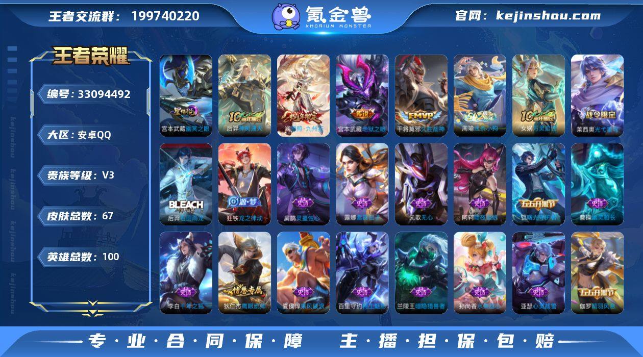 安卓Q-V3-至尊星耀V段位-100英雄-67皮肤-5传说-21史诗【传说皮肤】:马超神骥逐星野,后羿神树通天,澜愿照九州拓,干将莫邪久胜战神,宫本武藏地狱之眼【限定皮肤】:狄仁杰阴阳师,元歌无心,夏侯惇朔风刀,达摩沙漠行僧,项羽海滩派对,程咬金演武夺筹,钟馗驱傩正仪,苏烈千军破阵,明世隐疑决卦【年限皮肤】:澜愿照九州拓【赛季限定】:夏侯惇朔风刀,明世隐疑决卦,程咬金演武夺筹,钟馗驱傩正仪,苏烈千军破阵,达摩沙漠行僧,亚瑟荣光之誓【战令限定】:莱西奥光弋星穹,明世隐往忆晖光,周瑜线条小狗【史诗皮肤】:盘古撼世英歌,周瑜线条小狗,女娲万灵启世,莱西奥光弋星穹,后羿石田雨龙,扁鹊灵蛊蚀心,狂铁龙之律动,元歌无心,狄仁杰鹰眼统帅,伽罗箭羽风息,铠曙光守护者,百里守约特工魅影,雅典娜冰冠公主,亚瑟心灵战警,兰陵王暗隐猎兽者,夏侯惇乘风破浪,李白千年之狐,曹操幽灵船长,嬴政摇滚巨星,孙尚香水果甜心,阿轲暗夜猫娘,露娜紫霞仙子【其他皮肤】:妲己线条小狗,虞姬溯影追猎,艾琳鹤鸣心笺,明世隐往忆晖光,亚瑟荣光之誓,达摩爆裂喵拳,大司命暗都幽影,刘禅唤灵魔甲,达摩沙漠行僧,苏烈千军破阵,钟馗驱傩正仪,张良缤纷绘卷,程咬金...