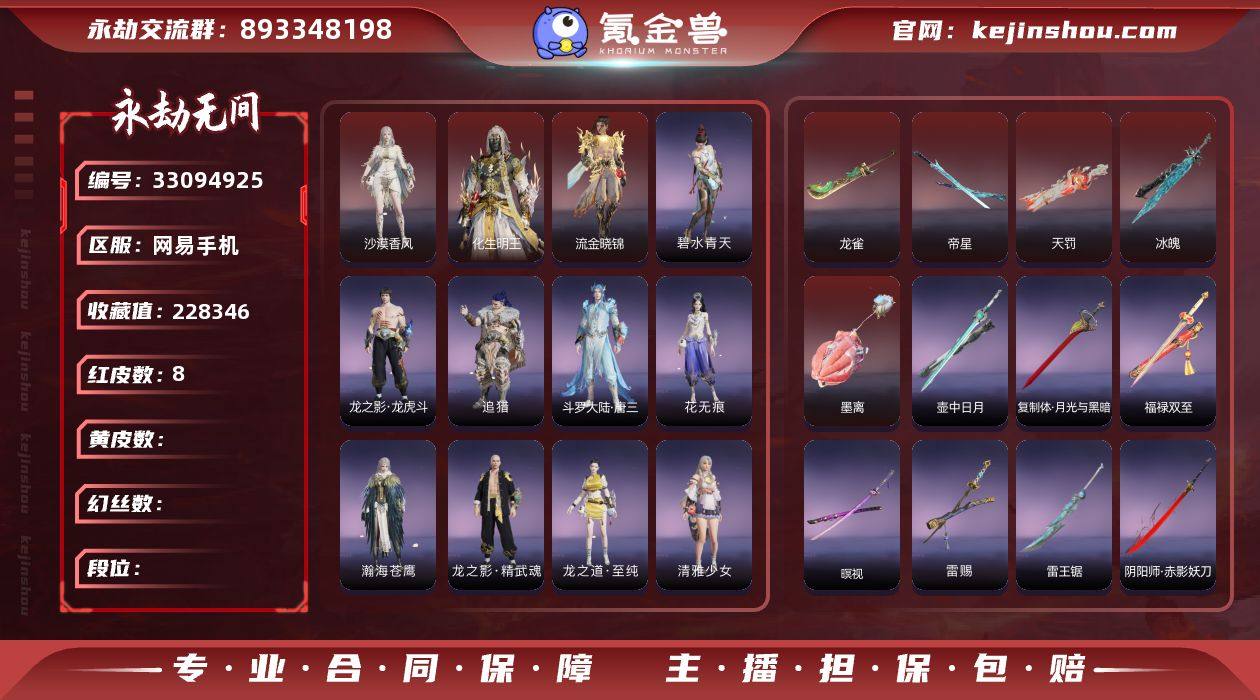 YJJ2174/5.2换绑/等级271/s20三人陨星4/9红423金收藏值228346/9红色神品:/化生明王/沙漠香风/流金晓锦/叩心/冰魄_/帝星/龙雀/天罚/墨离/【技能奥义】/神君印/竹韵悠/彩俑娃娃/星熠/炎烈珠/珥冰/御祥云/荆魂 宁红夜:/倒反阴阳炽羽/碧水青天/泠川发/双马尾女 沈妙:/悠竹萌客/紫衣仙子/奥村春NOIR/涂鸦少女/娇憨发/NOIR发型/双马尾女 天海:/化生明王/八宝龙王/双马尾男 殷紫萍:/朝颜/鹅黄纱梦/兰庭月/暖绒发/双马尾女 特木尔:/唐三/路奇迷踪/追猎/龙虎斗/海神发/双马尾男 季沧海:/不良人李星云/康复之星/鹧鸪天/精武魂/江海发/白狼发/不如吾发/双马尾男 胡桃:/至纯/星空投影/清雅少女/贵胄少女/双马尾女 妖刀姬:/暗夜利刃 崔三娘:/暗沼摩罗/无拘/弄潮发/冷傲发/双马尾女 岳山:/尼尔/铁面/金戈止/杨戬/过江龙/破荆者/玄鳞发/靖仇发/双马尾男 无尘:/黄庭道/一品仙君/未济袍/逍遥发/JOKER发型/双马尾男 顾清寒:/紫微星命/禄运玉霄/剪春漪/寒烟素/霜天发/绯霜发/春霁发/双马尾女 武田信中:/烈武者/双马尾男 迦南:/沙漠香风/赤焰舞影/凛冬/花无痕/瀚海苍鹰/烬舞发/双马尾女 胡为:/福瑞天泽/悟空/双马尾男 季莹莹:/盛夏白阳/冬无归/雾灼发/幽焰发/双马尾女 玉玲珑:/羞花/天道/丽娘/幽夜...