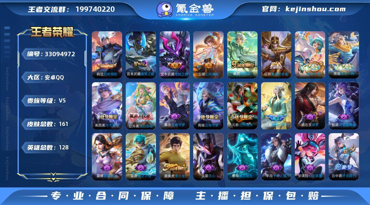 【编号41395,可秒换绑】【极品打野小号,带韩信荣耀典藏云缨幻光神枪,,桑启鸣野蒿,后羿黄金射手座,宫本武藏地狱之眼,赵怀真器灵·浮梦炉,等等皮肤】,,安卓Q-V5-永恒钻石IV段位-128英雄-161皮肤-1典藏皮肤-4传说-43史诗 【英雄全皮】:影全皮 【荣耀典藏】:韩信弑枪猎影 【传说皮肤】:云缨幻光神枪,桑启鸣野蒿,后羿黄金射手座,宫本武藏地狱之眼 【限定皮肤】:姜子牙天穹之誓,狄仁杰阴阳师,赵云皇家上将,墨子神迹守卫,孙尚香蔷薇恋人,元歌云间偶戏,元歌无心,狄仁杰万华元夜,项羽海滩派对,老夫子航海奇遇记,程咬金演武夺筹,李元芳银河之约,钟馗驱傩正仪,杨玉环遇见飞天,裴擒虎李小龙,米莱狄胡桃异想国,云中君纤云弄巧,上官婉儿梁祝,高渐离燃音魔法,沈梦溪龙舞盛年 【赛季限定】:狄仁杰万华元夜,程咬金演武夺筹,钟馗驱傩正仪,姜子牙天穹之誓,东皇太一噬灭天穹,太乙真人谧流熔炉,甄姬逆浪荇歌,亚瑟荣光之誓 【战令限定】:李元芳银河之约,元歌云间偶戏,米莱狄胡桃异想国,老夫子航海奇遇记,墨子神迹守卫,高渐离燃音魔法,亚连破空之剑,孙悟空神迹守卫,孙膑茶境仙,马超访茗客,周瑜百相守梦,孙策百相守梦,莱西奥光弋星穹,明世隐...