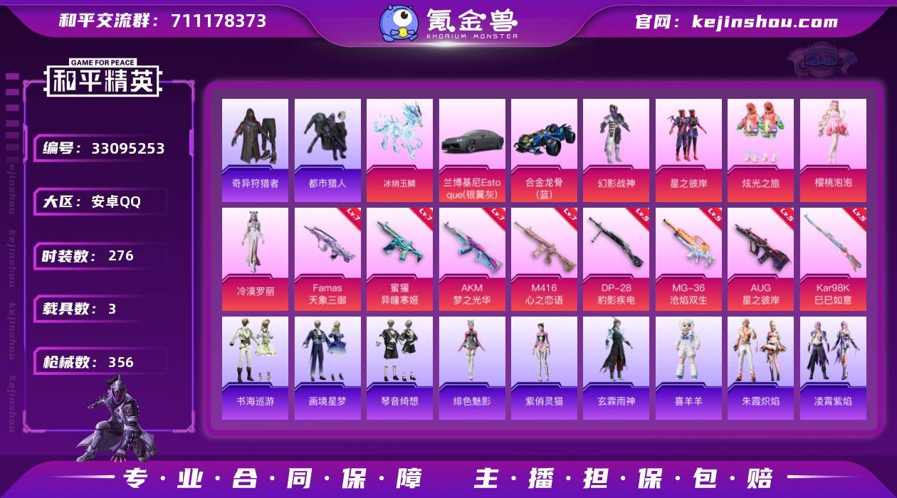 安卓 手Q-6粉装-11特效枪-3载具-6粉色飞行器-116267热力值-20王牌印记-276套装-356枪皮 【热门品类】:绝对防御上衣,套装-浪漫天命,套装-都市猎人,套装-奇异狩猎者,套装-龟仙人 【粉色套装】:粉装-幻影战神,粉装-星之彼岸,粉装-炫光之旅,角色-樱桃泡泡,角色-冷漠罗丽,角色-极地冰晶 【粉色枪皮等级】:UMP45-霜月狼主(三级),AKM-梦之光华(七级),M416-心之恋语(七级),AUG-星之彼岸(五级),蜜獾-异瞳寒姬(七级),Famas-天象三御(七级),ACE32-萌骑漫游(四级),Kar98K-巳巳如意(五级),DP-28-豹影疾电(五级),PKM-萌骑夺宝(五级),MG-36-沧焰双生(五级) 【粉色载具】:兰博基尼Estoque(银翼灰),合金龙骨(蓝),冰绡玉鳞 【粉色枪皮】:AKM-梦之光华,M416-心之恋语,AUG-星之彼岸,蜜獾-异瞳寒姬,Famas-天象三御,ACE32-萌骑漫游,UMP45-霜月狼主,Kar98K-巳巳如意,DP-28-豹影疾电,PKM-萌骑夺宝,MG-36-沧焰双生 【粉色飞行器】:炫彩糖果飞行器,星夜魔法师飞行翼,曦光华影飞行器,灵珠游龙飞行器,暮色之舞飞行器,冰狼掠影飞行器 【粉色降落伞】:至尊龙雀降落伞,春暖花开降落伞,伏魔团降落伞,星之彼岸降落伞,古战神甲降落伞,环太平洋降落伞,千面...