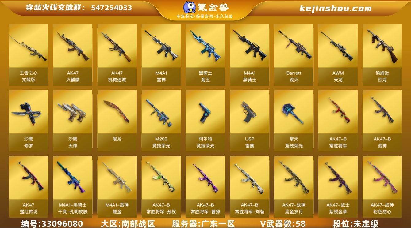 广东一区-59V-1王者-0炫金 【热门武器】:M200-竞技荣光,死亡之眼,M4A1-黑骑士,汤姆逊-烈龙*5,裁决-雪莉杨,USP-雷暴,沙鹰-修罗 【音效卡】:M4A1-雷神音效卡,M4A1-黑骑士音效卡,Barrett-毁灭音效卡 【皮肤】:雷神-耀金皮肤,火麒麟-平天大圣,火麒麟-心动糖果,毁灭-CFS2020,M4A1-千变-孔明皮肤,战神-粉色甜心皮肤,战神-紫绶金章皮肤,战神-流金岁月皮肤,AK47-B-常胜将军-曹操,AK47-B-常胜将军-刘备,AK47-B-常胜将军-孙权 【角色】:电竞教官-云悠悠,王者-瞳-闭月羞花,空,初恋灵狐,芳心审判者,风暴女*2,娟娟,龙儿,龙儿-小淘气,斯沃特-X,新娜塔莎,雪莉杨-摸金校尉 【人偶武器】:裁决-雪莉杨,迷你深渊冰龙,迷你裂空之翼,夺魂,迷你生化手雷,深渊终结者手雷,闪光弹-小乔,闪光弹-貂蝉,高爆手雷-大乔,迷你艾比 【暴走生化】:死亡之眼 【挑战大师】:AK47-冰龙粉碎者,冰龙粉碎者-白马银枪,激光毁灭者III,机甲撕裂者III,神圣爆裂者-末日III,阐释者III 【英雄级武器】:AK47-火麒麟*2,M4A1-雷神*3,M4A1-黑骑士,AK47-机械迷城,王者之心-觉醒版,AK-47-猩红传说,AK47-B-战神,黑骑士-海王,AK47-B-常胜将军,AWM-天龙,Barrett-毁灭,M20...