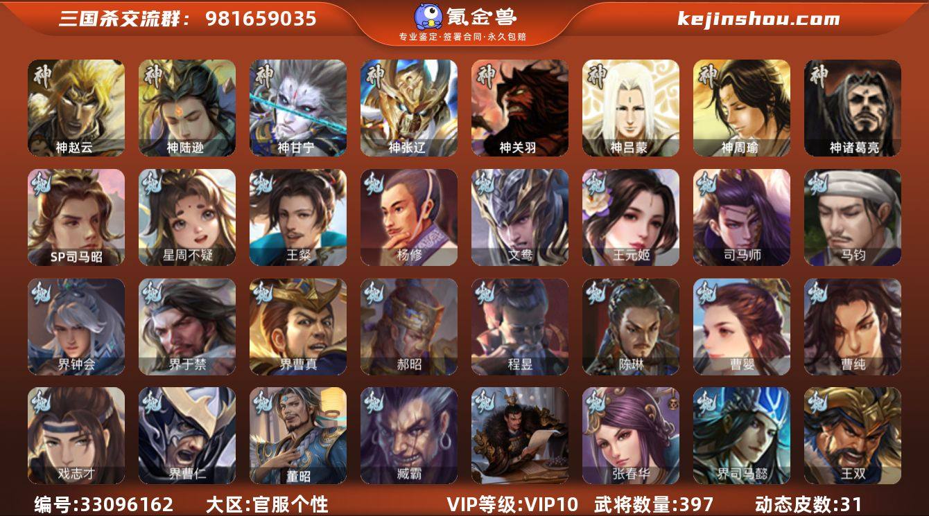 神赵云,神陆逊,神甘宁,神张辽,神诸葛亮,SP司马昭,星周不疑,王粲,杨修,王元姬,司马师,马钧,界钟会,界于禁,界曹真,郝昭,陈琳,曹婴,曹纯,戏志才,程昱,谋诸葛亮,谋赵云,谋马超,诸葛瞻,张星彩,王平,沙摩柯,谯周,界黄忠,花鬘,周处,吴景,骆统,留赞,界朱然,界徐盛,界步练师,贺齐,文鸯,裴秀,界沮授,左慈,张让,陶谦,审配,麹义,祢衡,沮授,界左慈,公孙康,陈登,许攸,兀突骨,士燮,神吕蒙,神周瑜,神关羽,SP关羽,SP曹仁,SP蔡文姬,乐进,曹昂,诸葛诞,朱灵,文聘,SP姜维,张春华,钟会,曹冲,郭淮,满宠,界王异,界曹操,界司马懿,界夏侯惇,界张辽,界许褚,界郭嘉,李典,曹真,韩浩史涣,陈群,曹休,钟繇,司马朗,王基,李通,郭皇后,孙资刘放,辛宪英,界甄姬,吕虔,鲁芝,蒯越蒯良,界典韦,界荀彧,界徐晃,杜畿,毌丘俭,界邓艾,贾逵,界曹植,界满宠,界郭淮,卞夫人,界陈群,华歆,王双,崔琰,毛玠,阮慧,曹嵩,谋徐晃,谋于禁,胡班,界夏侯渊,界曹仁,臧霸,唐咨,董昭,SP孙尚香,关银屏,夏侯霸,马良,关兴张苞,廖化,界马岱,关平,简雍,刘...