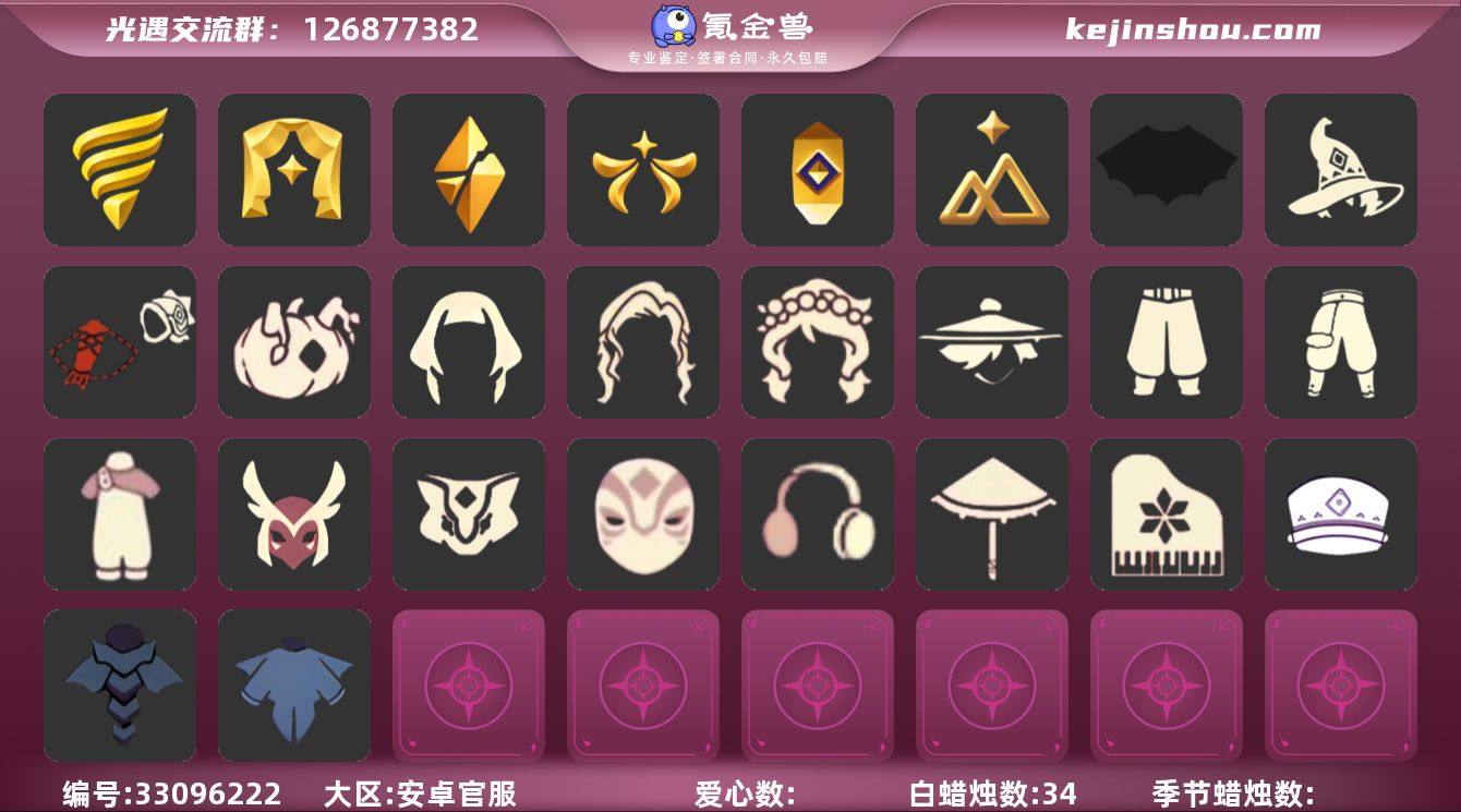 6季12翼帝企鹅发西部帽粗框眼镜季卡相机巫师帽蝙蝠斗武士裤虚荣正太头 【毕业图】晨岛,云野,雨林,霞谷,暮土,禁阁 【毕业季】潜海季,表演季,破晓季,欧若拉,追忆季,拾光季 【蜡烛】34 【爱心】548 【稀有礼包】星月头冠,彩虹耳饰,圣诞鹿角,巫师帽,玉兔发饰,鲤跃龙门,蝙蝠斗,白雪斗篷,绊爱礼包,瑞气纸伞,情人秋千,小憩茶桌,冥龙南瓜,雪花水晶球,大橘大利,南瓜头,福娃礼包 【毕业物品】潜水面具,单边小辫,维京斗篷,帝企鹅发,黄眉企鹅面具,燕尾斗篷,双翼遥鲲斗,冥龙斗篷,留辫蘑菇头,高领舞服,透明蝶翼斗,肩带,追忆之书,西部帽,粗框眼镜,季卡相机 【热门复刻】红吉他,星星面具,樱花发型,绿芽,海洋斗,武士裤,虚荣,正太头,猫猫头,背带裤,搓澡巾,花环长发,红耳机,箬笠,平顶帽,雨伞,高音钢琴,白金斗篷,黑金斗篷,红金斗篷,黄鼠狼面具,疯帽匠发型,女巫发型,失孤发型,蓝色音乐会,书虫发型,道袍,九色鹿面具 【光之翼】233,晨岛,禁阁,欧若拉季,拾光季,潜海季