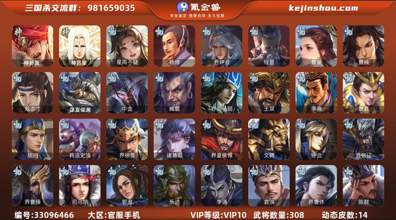 【14790018】官阶:骠骑将军;VIP等级:VIP10;史诗武将数量:30;动态皮肤数量:14;武将总数:308;史诗宝珠数量:0;将魂数量:3973;神将:1;魏国史诗武将:6;蜀国史诗武将:7;吴国史诗武将:3;群史诗武将:12