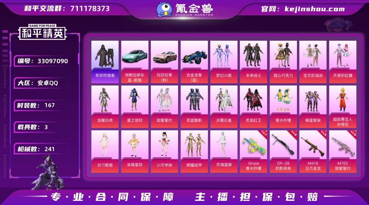 【特价出售/店主推荐】安卓 手Q-19粉装-9特效枪-3载具-6粉色飞行器-86947热力值-5王牌印记-167套装-241枪皮【热门品类】:粉装-梦幻火箭,套装-浪漫天命,套装-奇异狩猎者【粉色套装】:粉装-未来战士,粉装-甜心巧克力,粉装-宝贝奶油派,粉装-天使彩虹糖,粉装-金曜白虎,粉装-梦幻火箭,粉装-星之信仰,粉装-甜蜜誓约,粉装-苍蓝魅影,粉装-冰霜白皇,粉装-炙焰红王,粉装-香水柠檬,粉装-暗星紫秘,超级赛亚人-孙悟空,角色-白勺歌姬,角色-呆萌星弥,角色-小可学妹,粉装-辉耀战甲,角色-荧海星豚【粉色枪皮等级】:M416-五爪金龙(五级),GROZA-香水柠檬(七级),M762-甜蜜誓约(五级),UMP45-萌骑冒险(五级),Kar98K-绿意幻情(五级),Kar98K-巳巳如意(三级),M24-星之信仰(五级),SKS-诡面斩(五级),DP-28-豹影疾电(五级)【粉色载具】:特斯拉Roadster(水滴蓝),玛莎拉蒂Ghibli(粉),合金龙骨(蓝)【粉色枪皮】:M416-五爪金龙,GROZA-香水柠檬,M762-甜蜜誓约,UMP45-萌骑冒险,Kar98K-绿意幻情,Kar98K-巳巳如意,M24-星之信仰,SKS-诡面斩,DP-28-豹影疾电【粉色飞行器】:梦幻火箭飞行器,夏日绵绵冰飞行器,终极赛罗飞行器,童趣迷兔飞行器,全功率超战飞行器