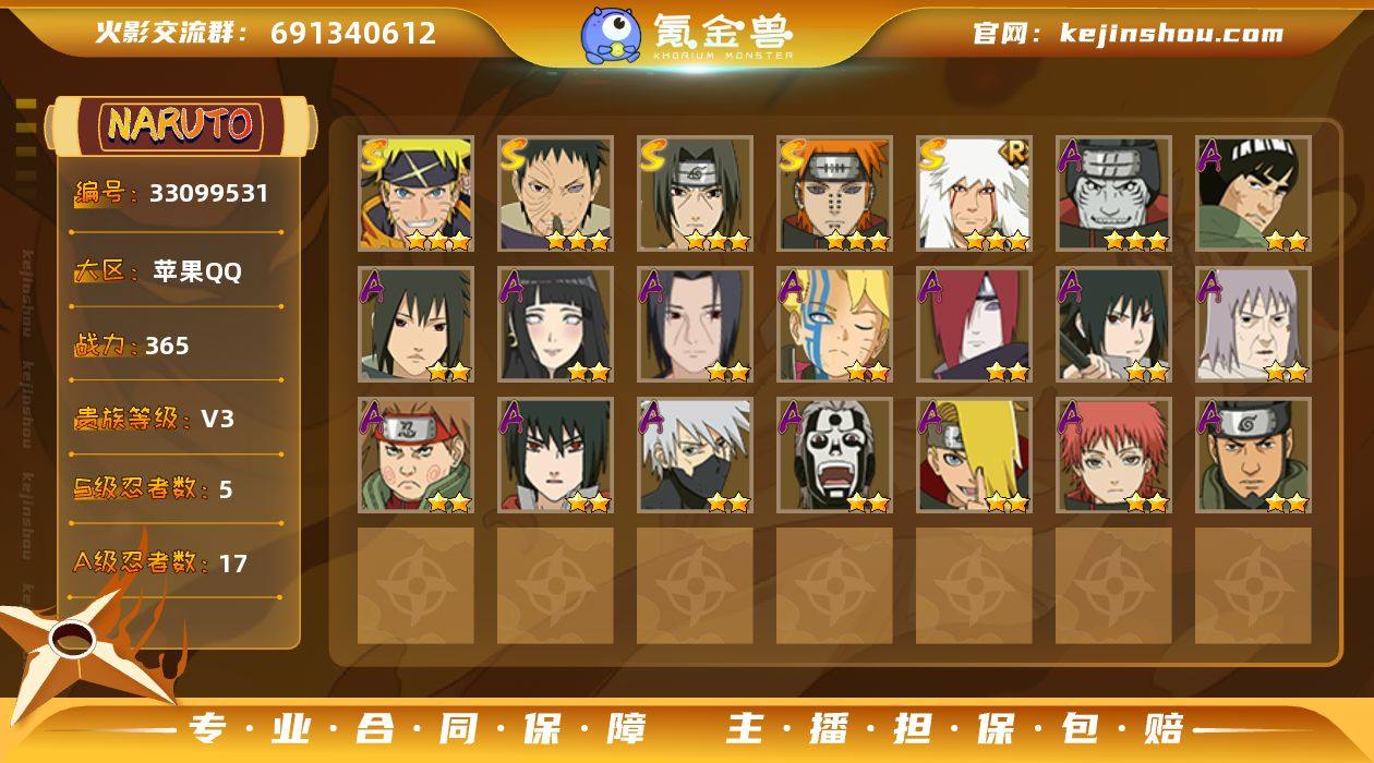 【BX210】【精品破面小号】苹果Q区【V3 5S忍 17A忍 13通灵 365W战力】 【S级忍者】:宇智波带土「忍界大战」(3星),宇智波鼬「须佐能乎」(3星),自来也「舞之豪杰」(3星),佩恩「天道」(3星),漩涡鸣人·宇智波佐助(3星) 【A级忍者】:长门「青年」(2星),迪达拉(2星),飞段「死司凭血」(2星),干柿鬼鲛(3星),漩涡博人「桃式显现」(2星),旗木卡卡西「万花筒写轮眼」(2星),旗木卡卡西「神威对决」(2星),蝎(2星),猿飞阿斯玛(2星),宇智波鼬「夏日限定」(2星),宇智波佐助「须佐能乎」(2星),宇智波佐助「万花筒写轮眼」(2星),日向雏田「最终章」(2星),秋道丁次「忍界大战」(2星),千代「近松十人卫」(2星),宇智波泉奈(2星),迈特凯「青春爆炸」(2星)