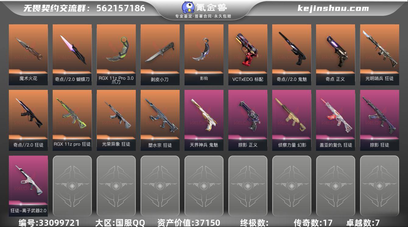 【自带包赔 可赔三倍】:库存价值 37150 【近战】: 魔术火花, 影钩, RGX 11z Pro//3.0 爪刀, 剥皮小刀, 奇点//2.0 蝴蝶刀 【狂徒】: 光明哨兵 狂徒, 盖亚的复仇 狂徒, 光荣异象 狂徒, RGX 11z Pro 狂徒, 离子武器//2.0 狂徒, 掠影 狂徒, 奇点//2.0 狂徒, 塑水宗 狂徒 【幻影】: 侦察力量 幻影 【正义】: 奇点 正义, 掠影 正义 【鬼魅】: 奇点//2.0 鬼魅, 天界神兵 鬼魅 【标配】: VCT x EDG 标配 【概要】: 总皮肤 75 终极0 传奇17 卓越7 刀皮5 英雄17 LV160 历史最高:钻石 当前段位:黄金 已使用 995 R点 剩余 205 R点 卡面、挂饰、其他皮肤请看截图 道具、段位等以实际验号为准。如账号因没有维护,赛季更新等不可抗因素发生变化,不属于账号质量问题"