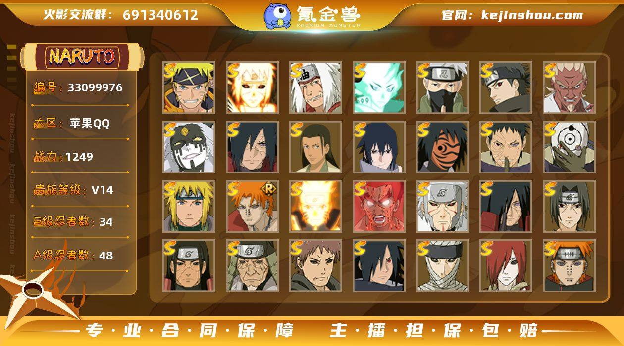 HY22077|苹果QQ 548区 1249w战力 v14 S忍者数:34 A忍者数:48 时装24苹果QQ 548区 S忍者数:34 A忍者数:48 忍者:漩涡鸣人·宇智波佐助,波风水门「九喇嘛连结」,自来也「传说中的三忍」,大筒木舍人「最终章」,旗木卡卡西「须佐能乎」,宇智波止水「须佐能乎」,艾「忍界大战」,大筒木桃式,宇智波斑「秽土转生·解」,千手柱间「木叶创立」,宇智波佐助「永恒万花筒」,神秘面具男「红夜之刃」,春野樱「忍界大战」,大筒木金式,漩涡鸣人「九喇嘛连结」,大野木「忍界大战」,迈特凯「死门」,宇智波斑「木叶创立」,宇智波带土「忍界大战」,千手柱间「秽土转生」,罗砂「四代目风影」,自来也「舞之豪杰」,佩恩·天道「超」,宇智波斑「秽土转生」,宇智波斑「白面具」,千手扉间「秽土转生」,无「二代目土影」,猿飞日斩「秽土转生」,长门「秽土转生」,宇智波鼬「须佐能乎」,佩恩「天道」,波风水门,大蛇丸,自来也,小南「神驹佑将」,迈特凯「青春爆炸」,宇智波带土「漂泊浪客」,宇智波泉奈,蝎「绯流琥」,李洛克「忍界大战」,旗木卡卡西「幻之真容」,日向雏田「最终章」,漩涡博人「桃式显现」,小南「漂泊浪客」,角都「秽土转生」,日向宁次「忍界大战」,长十郎「六代目水影」,卑留呼「火之意志继承者」,...
