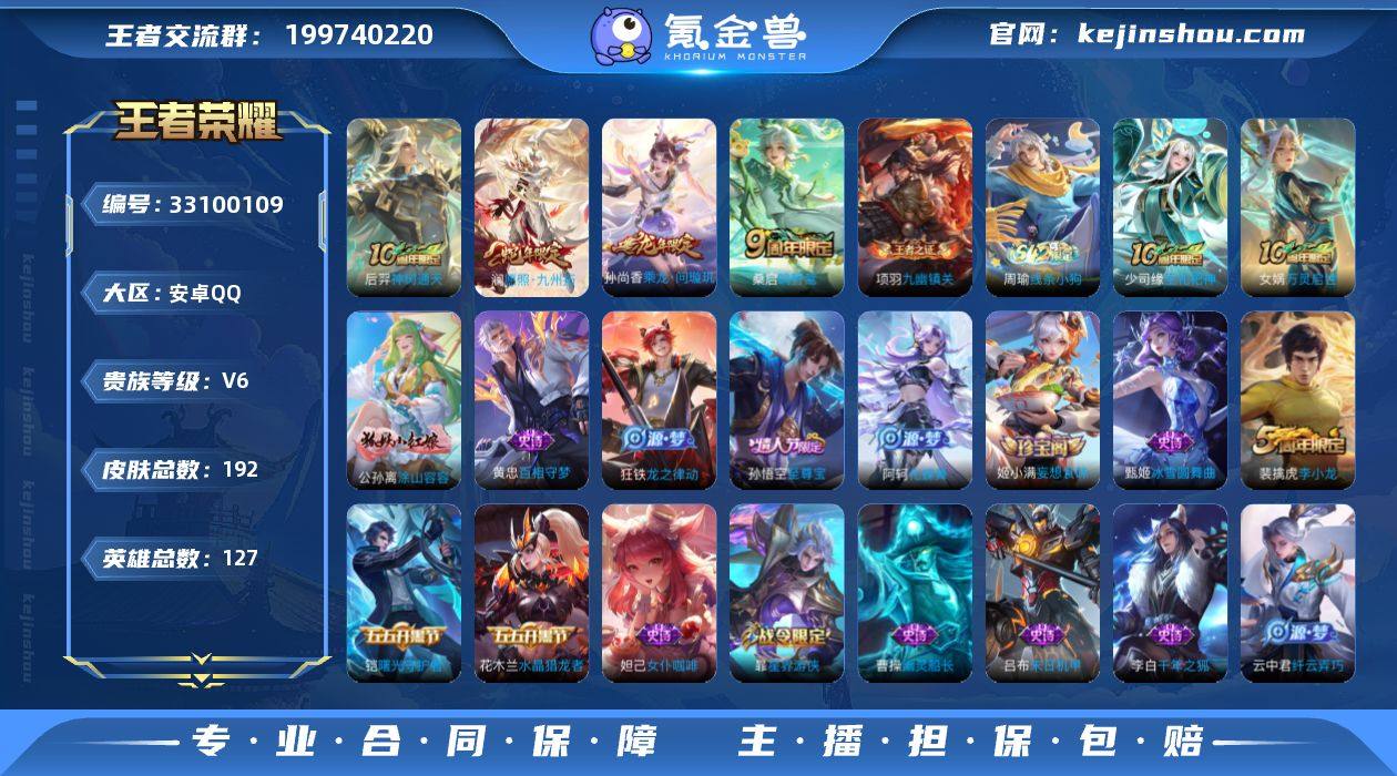 安卓Q【至尊宝】-V6-尊贵铂金III段位-127英雄-192皮肤-4传说-47史诗 【英雄全皮】:孙权全皮,空空儿全皮,影全皮 【传说皮肤】:后羿神树通天,澜愿照九州拓,桑启鸣野蒿,孙尚香乘龙问璇玑 【限定皮肤】:大乔绒语心约,姜子牙天穹之誓,狄仁杰阴阳师,赵云皇家上将,狄仁杰魔术师,项羽海滩派对,孙悟空至尊宝,李元芳匿光侦查者,李元芳云中旅人,干将莫邪胡桃夹子,百里玄策原初追逐者,沈梦溪大漠名商,裴擒虎李小龙,裴擒虎擒涛扼浪,云中君纤云弄巧,嫦娥暖冬兔眠,鲁班大师探海日志,桑启海盐诗旅,暃星界游侠,阿古朵江河有灵,张良古海寻踪,蒙犽百解令,高渐离燃音魔法,妲己灵卜魔法,鬼谷子天穹祈灯,姬小满妄想食味,孙尚香乘龙问璇玑,沈梦溪龙舞盛年,刘邦剑破天穹,程咬金群星魔术团,刘备异域游侠,周瑜熔金海岸 【年限皮肤】:孙尚香乘龙问璇玑,澜愿照九州拓 【赛季限定】:沈梦溪大漠名商,李元芳云中旅人,桑启海盐诗旅,裴擒虎擒涛扼浪,鲁班大师探海日志,张良古海寻踪,鬼谷子天穹祈灯,刘邦剑破天穹,姜子牙天穹之誓,东皇太一噬灭天穹,太乙真人谧流熔炉,钟馗虚灵犬护,甄姬逆浪荇歌,亚瑟荣光之誓,百里玄策原初追逐者,牛魔星界战将,项羽九幽...