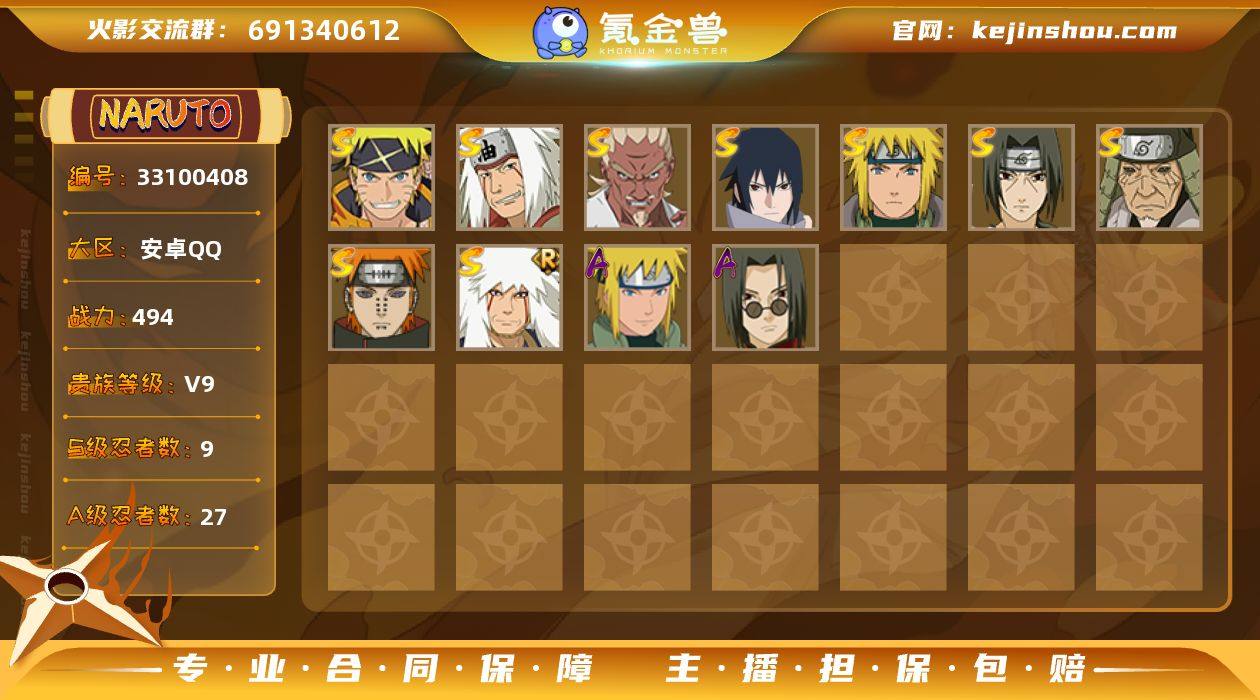 HY22081|【可实名】可二次 494w战力 v9 安卓QQ 3474区 S忍者数:9 A忍者数:27 时装9安卓QQ 3474区 S忍者数:9 A忍者数:27 忍者:漩涡鸣人·宇智波佐助,自来也「传说中的三忍」,艾「忍界大战」,宇智波佐助「永恒万花筒」,自来也「舞之豪杰」,猿飞日斩「秽土转生」,宇智波鼬「须佐能乎」,佩恩「天道」,波风水门,小南「神驹佑将」,迈特凯「青春爆炸」,宇智波佐助「侠隐江湖」,宇智波带土「漂泊浪客」,宇智波泉奈,蝎「绯流琥」,黑绝,日向雏田「最终章」,漩涡博人「桃式显现」,长十郎「六代目水影」,卑留呼「火之意志继承者」,波风水门「青年」,黑土「四代目土影」,千代「近松十人卫」,宇智波鼬「新春限定」,秋道丁次「忍界大战」,春野樱「百豪」,宇智波佐助「万花筒写轮眼」,飞段「死司凭血」,飞段,迪达拉,我爱罗「疾风传」,蝎,干柿鬼鲛,宇智波鼬,猿飞阿斯玛,迈特凯,二位由木人「奇拉比落风传」,重吾「忍界大战」,雨琉「羁绊」,野原琳「漂泊浪客」,佐井「最终章」,月光疾风「秽土转生」,夕日红「冬日限定」,佩恩「饿鬼道」,犬塚花,奈良鹿丸「最终章」,佩恩「人间道」,天天「峨眉宗师」,枫「新佩恩六道」,萨姆伊「新春限定」,鬼灯满月「忍刀七人众」,宇智波鼬「红夜之刃」,春野樱「忍者...