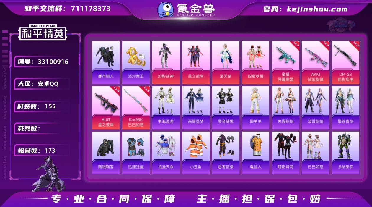 眼罩 金鞋都市 满级地铁安卓 手Q-4粉装-8特效枪-0载具-1粉色飞行器-52416热力值-7王牌印记-155套装-173枪皮 【热门品类】:套装-浪漫天命,套装-都市猎人,套装-派对舞王,套装-小丑鱼,套装-忍者信条,套装-龟仙人,套装-暗影哥特 【粉色套装】:粉装-幻影战神,粉装-星之彼岸,角色-洛天依,粉装-甜蜜草莓 【粉色枪皮等级】:AKM-炫紫旋律(七级),AUG-星之彼岸(五级),蜜獾-异瞳寒姬(七级),UMP45-萌骑冒险(五级),AKS-74U-森灵之息(五级),Kar98K-巳巳如意(五级),Mk14-福马献瑞(五级),DP-28-豹影疾电(五级) 【粉色枪皮】:AKM-炫紫旋律,AUG-星之彼岸,蜜獾-异瞳寒姬,UMP45-萌骑冒险,AKS-74U-森灵之息,Kar98K-巳巳如意,Mk14-福马献瑞,DP-28-豹影疾电 【粉色飞行器】:炫彩糖果飞行器 【粉色降落伞】:幻影战神降落伞,未来战士降落伞,梦幻火箭降落伞,星之彼岸降落伞,洛神天依降落伞,甜蜜草莓降落伞,樱桃泡泡降落伞,炫彩糖果降落伞 【稀有套装】:套装-龟仙人,套装-巳巳如意,套装-雪国风尚,套装-炫彩糖果,套装-马上来财,套装-迅捷龙虾,角色-多纳泰罗,套装-燕燕于飞,套装-鱼渊荷华,套装-闪电轻猫,套装-云朵鹅,套装-雪绒豹,角色-灵公主,套装-朱霞炽...