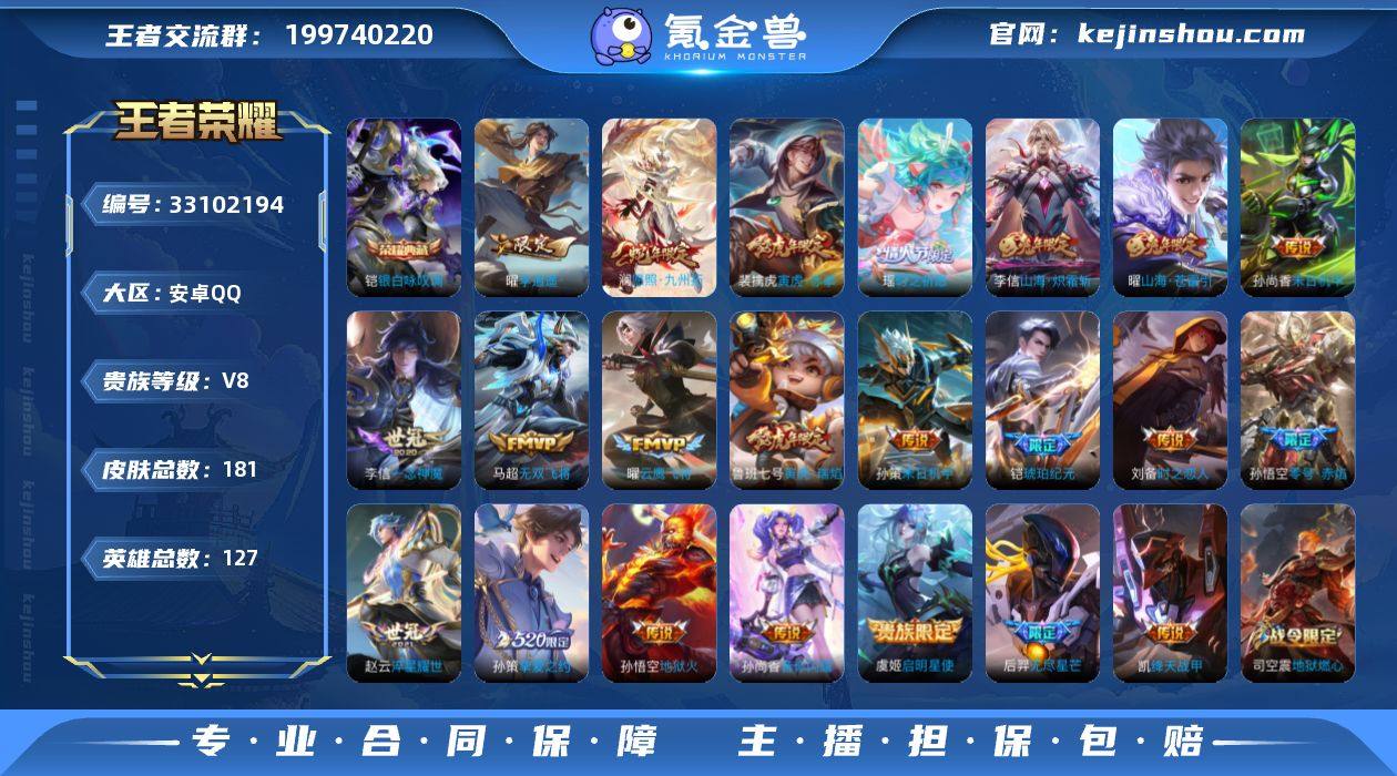 账号亮点:铠银白咏叹调 澜愿照九州拓,铠琥珀纪元,曜山海苍雷引,李信山海炽霜斩,孙尚香音你闪耀,后羿无尽星芒,马超无双飞将,孙策挚爱之约,孙策末日机甲,瑶时之祈愿,裴擒虎寅虎赤拳,鲁班七号寅虎瑞焰,赵云淬星耀世,曜李逍遥 ,铠绛天战甲,虞姬启明星使,孙悟空零号赤焰,曜云鹰飞将,李信一念神魔,刘备时之恋人,孙尚香末日机甲,孙悟空地狱火489-7 【荣耀典藏】:铠银白咏叹调 【传说皮肤】:澜愿照九州拓,铠琥珀纪元,曜山海苍雷引,李信山海炽霜斩,孙尚香音你闪耀,后羿无尽星芒,马超无双飞将,孙策挚爱之约,孙策末日机甲,瑶时之祈愿,裴擒虎寅虎赤拳,鲁班七号寅虎瑞焰,赵云淬星耀世,曜李逍遥 ,铠绛天战甲,虞姬启明星使,孙悟空零号赤焰,曜云鹰飞将,李信一念神魔,刘备时之恋人,孙尚香末日机甲,孙悟空地狱火 【限定皮肤】:狄仁杰阴阳师,廉颇寅虎御盾,赵云皇家上将,赵云百木心枪,嬴政优雅恋人,鲁班七号寅虎瑞焰,庄周高山流水,孙膑寅虎展翼,白起夜都怪侠,芈月幻夜卜梦,元歌无心,马可波罗暗影游猎,狄仁杰魔术师,达摩沙漠行僧,项羽海滩派对,露娜一生所爱,韩信傲雪梅枪,王昭君午后时光,兰陵王金庭之子,孙悟空零号赤焰,后羿如...