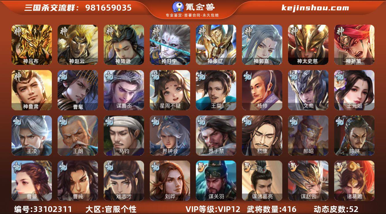 标题:S37064 VIP等级:VIP12 官阶:大将军 史诗武将数量:70 动态皮肤数量:52 史诗宝珠数量:45 将魂数量:5151 雁翎数量:44441 心愿积分:4599 史诗武将(魏国):文鸯,曹髦,谋曹丕,马钧,曹婴,王元姬,界钟会,戏志才,王朗,星周不疑,王凌,嵇康,杨修,陈琳,刘晔,王粲,界于禁,程昱,曹纯,郝昭 史诗武将(蜀国):谋关羽,谋诸葛亮,谋赵云,傅佥,沙摩柯,关索,花鬟,谯周,张星彩,王平,诸葛瞻,界黄忠,马云禄,赵襄 史诗武将(吴国):孙寒华,界徐盛,留赞,骆统,势太史慈,张奋,界朱然,贺齐,孙皓,文鸯 史诗武将(群雄):刘焉,星董卓,杜预,界左慈,南华老仙,麹义,谋张角,庞德公,界李儒,星黄忠,张让,王允,卑弥呼,左慈,兀突骨,沮授,陶谦,苏飞 史诗武将(神将):神郭嘉,神甘宁,神孙策,神鲁肃,神太史慈,神赵云,神陆逊,神吕布,神张辽