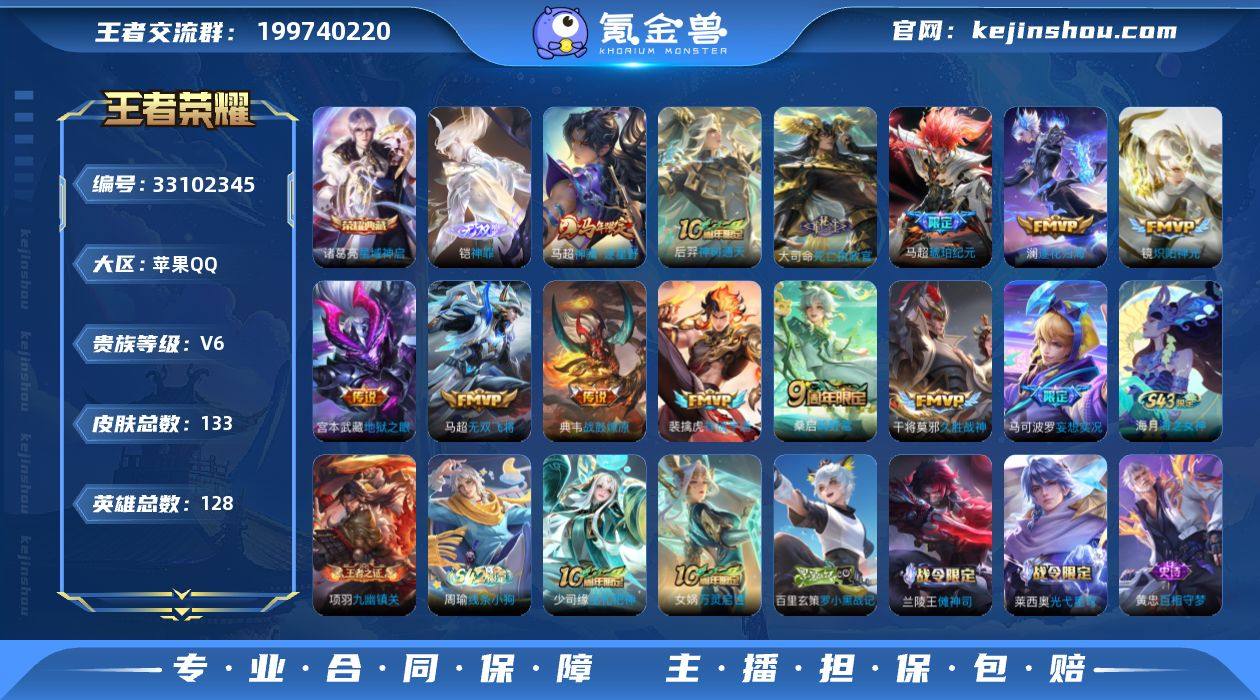 苹果Q-V6-永恒钻石I段位-128英雄-133皮肤-1典藏皮肤-1无双-13传说-32史诗 【荣耀典藏】:诸葛亮星域神启 【无双皮肤】:铠神罪 【传说皮肤】:马超神骥逐星野,后羿神树通天,大司命死亡执政官,裴擒虎祥瑞亨通,桑启鸣野蒿,典韦战鼓燎原,马超琥珀纪元,澜逐花归海,马可波罗妄想实况,马超无双飞将,镜炽阳神光,干将莫邪久胜战神,宫本武藏地狱之眼 【限定皮肤】:姜子牙天穹之誓,李白谪仙醉月,狄仁杰阴阳师,赵云皇家上将,孙尚香蔷薇恋人,马可波罗妄想实况,狄仁杰魔术师,项羽海滩派对,百里玄策原初追逐者,裴擒虎擒涛扼浪,鲁班大师探海日志,司空震地狱燃心,张良古海寻踪,鬼谷子天穹祈灯,马超琥珀纪元,刘邦剑破天穹,程咬金群星魔术团,周瑜熔金海岸 【赛季限定】:裴擒虎擒涛扼浪,鲁班大师探海日志,张良古海寻踪,鬼谷子天穹祈灯,刘邦剑破天穹,姜子牙天穹之誓,东皇太一噬灭天穹,太乙真人谧流熔炉,钟馗虚灵犬护,甄姬逆浪荇歌,亚瑟荣光之誓,百里玄策原初追逐者,项羽九幽镇关 【战令限定】:司空震地狱燃心,周瑜百相守梦,孙策百相守梦,兰陵王傩神司,莱西奥光弋星穹,明世隐往忆晖光,周瑜线条小狗 【史诗皮肤】:周瑜线条小狗,项羽九幽镇关,...