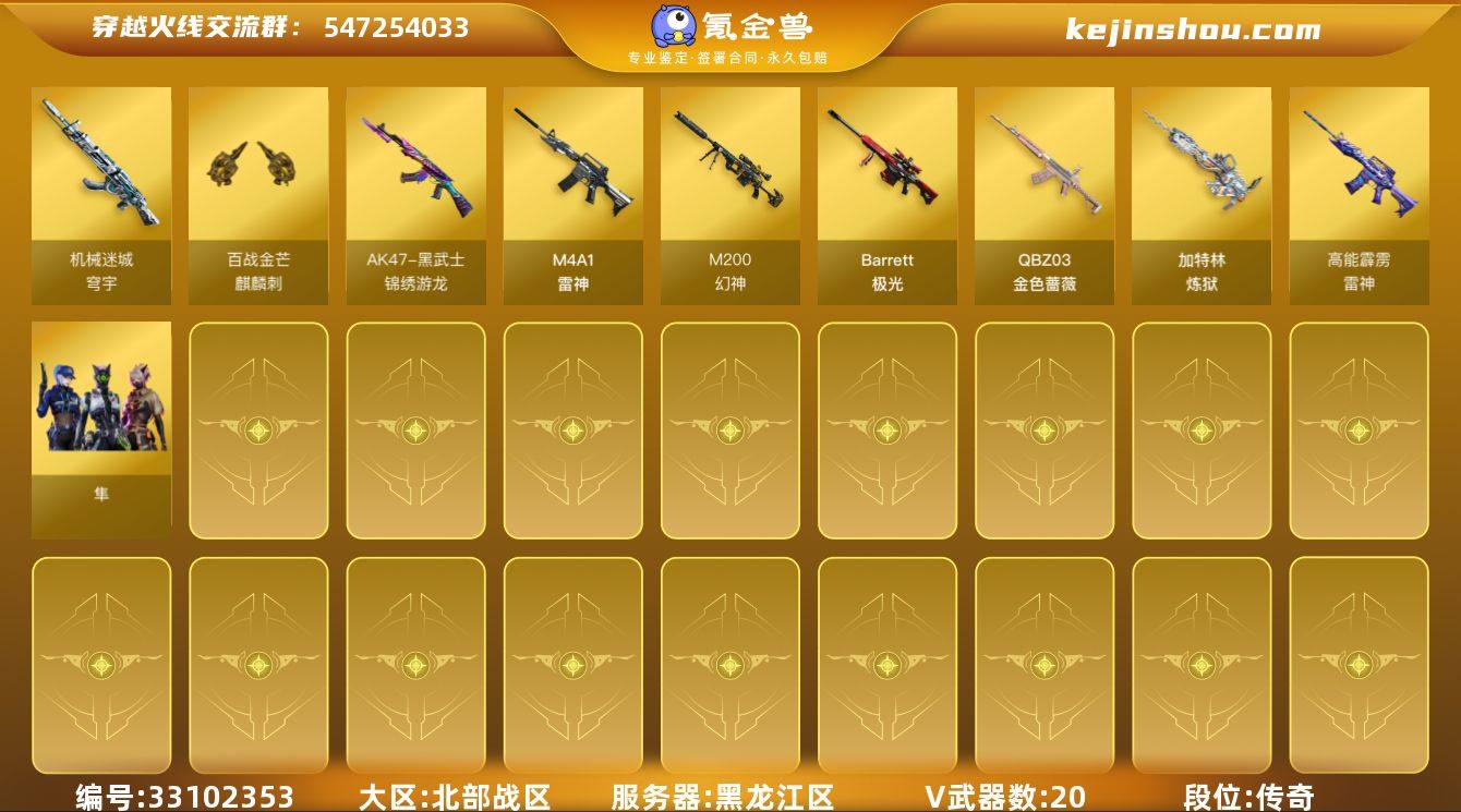 【ky6108】黑龙江区-21V-0王者武器数-0炫金武器数 【热门武器】:QBZ03-金色蔷薇,M200-幻神*2,加特林-炼狱 【皮肤】:幻神-电竞之星 皮肤,雷神-高能霹雳 皮肤,M4A1-再燃火线,雷神-课桌奇兵 皮肤,雷神-神秘按键 皮肤,轻型军用手斧-再燃火线 【角色】:隼,飞虎队-X,风暴女,兰-海滩派对,灵狐者-职业经理,麻雀,潘多拉-X,蜀雪,新娜塔莎 【人偶武器】:迷你深渊冰龙,迷你生化手雷 【英雄级武器】:M4A1-雷神*2,黑武士-锦绣游龙,QBZ03-金色蔷薇,HK417-朱雀-电竞之星,机械迷城-穹宇,Barrett-极光,M200-幻神*2,加特林-炼狱,柯尔特-荣耀世冠EP,麒麟刺-百战金芒,高爆手雷-幻灵,闪光弹-幻灵,烟雾弹-幻灵,烟雾弹-荣耀世冠EP*2 【道具】:亚洲杯纪念炫彩背包,女皇终结者-魔龙之吻,灵魂忍者,迷雾幽灵,夺命之镰,防化服*2,萌萌小葵表情,电玩兔兔表情,防弹头盔,防弹衣,C4工具钳,手雷包 【特殊枪械】:1炼狱