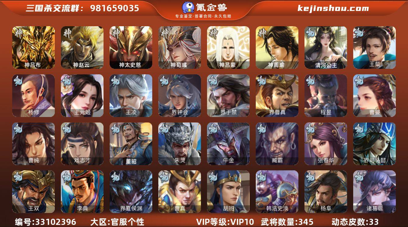 VIP等级: VIP10 官阶: 大将军 武将数量: 345 动态皮肤数量: 33 神将: 神吕布,神太史慈,神荀彧,神赵云,神吕蒙,神周瑜 魏国武将: 戏志才,曹纯,曹婴,程昱,界曹真,界于禁,界钟会,王凌,王元姬,杨修,王粲,唐咨-魏,张辽,SP蔡文姬,SP关羽,SP贾诩,SP姜维,卞夫人,蔡贞姬,曹昂,曹操,曹冲,曹洪,曹丕,曹仁,曹叡,王异,张恭,鲁芝,界满宠,曹休,界曹植,满宠,荀攸,王基,钟繇,郭嘉,牵招,荀彧,阮慧,杜畿,界郭嘉,崔琰,界曹丕,界荀彧,朱灵,辛毗,吕虔,界王异,界许褚,界郭淮,华歆,陈群,司马孚,袁涣,李通,乐进,辛宪英,郭淮,毛玠,郭皇后,毌丘俭,夏侯惇,曹植,司马朗,谋于禁,界曹操,许褚,界张辽,谋徐晃,张郃,钟会,文聘,曹彰,界夏侯惇,诸葛诞,司马懿,甄姬,杨阜,徐晃,韩浩史涣,胡班,曹真,典韦,界夏侯渊,夏侯渊,李典,于禁,王双,邓艾,界司马懿,张春华,臧霸,牛金,朱灵(国战),清河公主,董昭 蜀国武将: 董允,关索,花鬘,谯周,张星彩,赵襄,周群,诸葛瞻,谋马超,谋赵云,马云騄,徐庶,吕凯,界关羽,界诸葛亮,邓芝,费祎,严颜,界黄月英,赵云,张松,李丰,界刘备,刘封,糜竺,谋庞统,黄月英,刘巴,关羽,吴懿,向宠,祝融,张飞,黄皓,魏延,马忠,界法正,糜夫人,刘禅,界赵云,界姜维,张翼,关银屏,SP孙尚香,SP徐庶,卧龙诸葛,宗预,周仓,简...