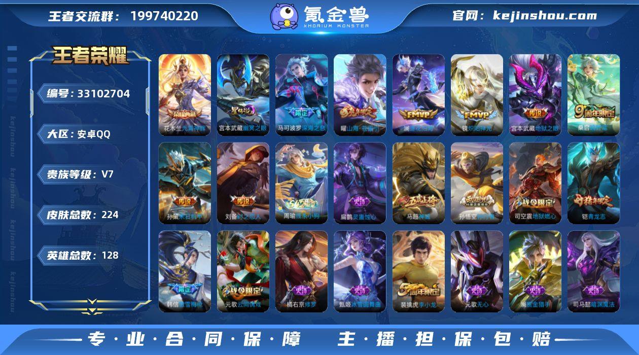 王者20543,扣扣钱包无法注销,安卓Q-V7-永恒钻石I段位-128英雄-224皮肤-1典藏皮肤-8传说-57史诗 【英雄全皮】:影全皮 【荣耀典藏】:花木兰九霄神辉 【传说皮肤】:桑启鸣野蒿,澜逐花归海,曜山海苍雷引,马可波罗深海之息,孙策末日机甲,镜炽阳神光,刘备时之恋人,宫本武藏地狱之眼 【限定皮肤】:狄仁杰阴阳师,赵云皇家上将,庄周高山流水,高渐离玩趣恶龙,芈月幻夜卜梦,吕布猎兽之王,元歌云间偶戏,元歌无心,马可波罗深海之息,狄仁杰魔术师,狄仁杰万华元夜,达摩沙漠行僧,项羽海滩派对,程咬金演武夺筹,韩信傲雪梅枪,兰陵王金庭之子,亚瑟潮玩骑士王,孙悟空孙行者,后羿圣弓游侠,李元芳云中旅人,钟馗驱傩正仪,干将莫邪真爱魔法,鬼谷子原初探秘者,鬼谷子五谷丰年,黄忠火炮绅士,铠青龙志,苏烈千军破阵,百里玄策原初追逐者,沈梦溪大漠名商,裴擒虎李小龙,裴擒虎擒涛扼浪,云中君纤云弄巧,嫦娥拒霜思,曜山海苍雷引,鲁班大师探海日志,镜匿光追影者,桑启海盐诗旅,艾琳女武神,艾琳流音漫舞,司空震地狱燃心,阿古朵江河有灵,张良古海寻踪,蒙犽百解令,蒙恬荣光圣徽,高渐离燃音魔法,妲己灵卜魔法,鬼谷子天穹祈灯,刘邦剑破天穹 【年限皮肤...