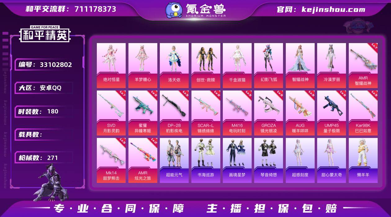 安卓 手Q-无敌战神框-9粉装-15特效枪-0载具-3粉色飞行器-86282热力值-19王牌印记-180套装-271枪皮 【热门品类】:套装-浪漫天命,套装-龟仙人 【粉色套装】:角色-绝对恒星,角色-洛天依,套装-创世·救赎,角色-千金淑猫,粉装-幻影飞狐,角色-智耀战神,角色-冷漠罗丽,角色-羊梦糖心,角色-虹云熊熊 【粉色枪皮等级】:SCAR-L-锦绣绵绵(五级),M416-电玩时刻(五级),GROZA-镜光银凌(五级),AUG-暖羊咩咩(五级),蜜獾-异瞳寒姬(五级),UMP45-量子极限(五级),AKS-74U-森灵之息(五级),Kar98K-巳巳如意(五级),Mk14-甜梦熊击(五级),Mk14-福马献瑞(五级),AMR-炫光之旅(二级),AMR-智耀战神(七级),SVD-月影灵韵(七级),AA12-G-萌骑幻想(五级),DP-28-豹影疾电(五级) 【粉色枪皮】:SCAR-L-锦绣绵绵,M416-电玩时刻,GROZA-镜光银凌,AUG-暖羊咩咩,蜜獾-异瞳寒姬,UMP45-量子极限,AKS-74U-森灵之息,Kar98K-巳巳如意,Mk14-甜梦熊击,Mk14-福马献瑞,AMR-炫光之旅,AMR-智耀战神,SVD-月影灵韵,AA12-G-萌骑幻想,DP-28-豹影疾电 【粉色飞行器】:绝对恒星飞行器,炫彩糖果飞行器,极意拳锋飞行器 【粉色降落伞】:绝对恒星降落伞,神秘黑猫降落伞,星之彼岸降落伞,恐龙拽...