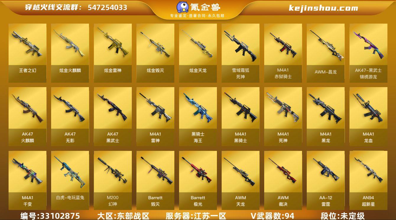 江苏一区-106V-6王者武器数-8炫金武器数 【传说角色】:传说星骇 【热门武器】:QBZ03-金色蔷薇,M200-幻神,死亡之眼,白虎-电玩蓝兔,Cat-刀锋,M4A1-黑骑士*6,汤姆逊-烈龙*6,RPK-盘龙*5,加特林-炼狱*2,羊驼玩偶,沙鹰-修罗*4 【王者炫金武器】:王者之幻,炫金火麒麟,炫金骑士*3,炫金雷神,炫金武士,炫金毁灭,炫金天龙 【音效卡】:修罗-云海游龙音效卡,M4A1-黑骑士音效卡,Barrett-毁灭音效卡,HK417-朱雀音效卡,M4A1-苍鸣雷神音效卡,M4A1-赤狱骑士-怀旧音效卡,Barrett-碧霄极光音效卡*2,麒麟刺-百战金芒-盛典舞曲音效卡,炼狱-百战金芒-庆典舞曲音效卡,死神-雪域霜狐-怀旧音效卡,AWM-昌龙-怀旧音效卡 【皮肤】:AWM-裁决-凤灵皮肤,裁决-运输船 皮肤,雷神-星空,雷神-宇航兔皮肤,雷神-海滩派对 皮肤,M4A1-雷神-拼搏,M4A1-再燃火线,火麒麟-百城,AK47-火麒麟-百城23冠军皮肤,毁灭-荣耀之怒,毁灭-英雄计划 皮肤,黑龙-能量核心,黑骑士耀金皮肤,无影-能量核心,AWM-天龙-传奇70KG,天神-春花弄影 皮肤,屠龙-荣耀之锋,屠龙-春桃 皮肤,屠龙-惊鸿 皮肤,龙啸-醒狮 皮肤,轻型军用手斧-再燃火线 【角色】:零,玄豹,零·纪元,战地猎狐,雪域霜狐,...