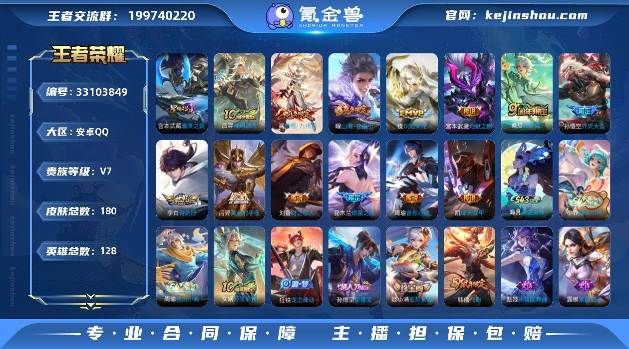 王者20519,安卓Q-V7-永恒钻石IV段位-128英雄-180皮肤-13传说-38史诗 【英雄全皮】:敖隐全皮 【传说皮肤】:后羿神树通天,澜愿照九州拓,桑启鸣野蒿,花木兰燃星之曲,孙悟空齐天大圣,曜山海苍雷引,李白诗剑行,周瑜音你心动,铠绛天战甲,镜炽阳神光,刘备时之恋人,后羿黄金射手座,宫本武藏地狱之眼 【限定皮肤】:狄仁杰阴阳师,赵云皇家上将,高渐离玩趣恶龙,元歌无心,狄仁杰魔术师,狄仁杰万华元夜,达摩沙漠行僧,项羽海滩派对,老夫子醍醐杖,韩信飞衡,花木兰燃星之曲,孙悟空至尊宝,孙悟空齐天大圣,李元芳云中旅人,鬼谷子原初探秘者,鬼谷子五谷丰年,沈梦溪大漠名商,裴擒虎李小龙,裴擒虎擒涛扼浪,曜山海苍雷引,鲁班大师探海日志,桑启海盐诗旅,阿古朵江河有灵,张良古海寻踪,鬼谷子天穹祈灯,姬小满妄想食味,沈梦溪龙舞盛年,刘邦剑破天穹,程咬金群星魔术团,周瑜熔金海岸 【年限皮肤】:韩信飞衡,曜山海苍雷引,澜愿照九州拓 【赛季限定】:老夫子醍醐杖,鬼谷子原初探秘者,狄仁杰万华元夜,达摩沙漠行僧,沈梦溪大漠名商,李元芳云中旅人,桑启海盐诗旅,裴擒虎擒涛扼浪,鲁班大师探海日志,张良古海寻踪,鬼谷子天穹祈灯,刘邦剑破天穹,东...