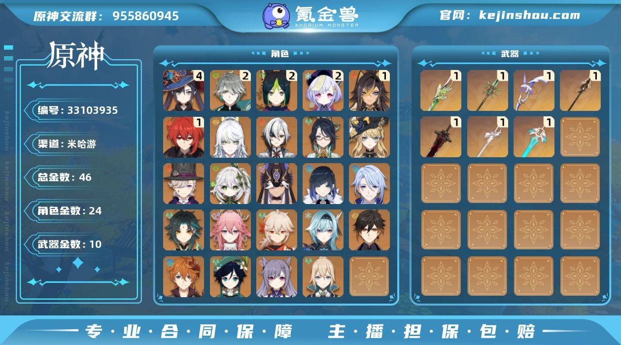 59级/46黄/女主/24个五星角色/10个五星武器 0命阿蕾奇诺,0命闲云,0命娜维娅,0命林尼,1命迪希雅,2命艾尔海森,0命纳西妲,0命赛诺,2命提纳里,0命夜兰,0命神里绫人,0命八重神子,0命优菈,0命枫原万叶,0命钟离,0命魈,0命温迪,0命达达利亚,0命刻晴,2命七七,0命琴,4命莫娜,1命迪卢克,0命兹白,精1裁叶萃光,精1和璞鸢,精1贯虹之槊,精1阿莫斯之弓,精1天空之刃,精1风鹰剑,精1狼的末路
