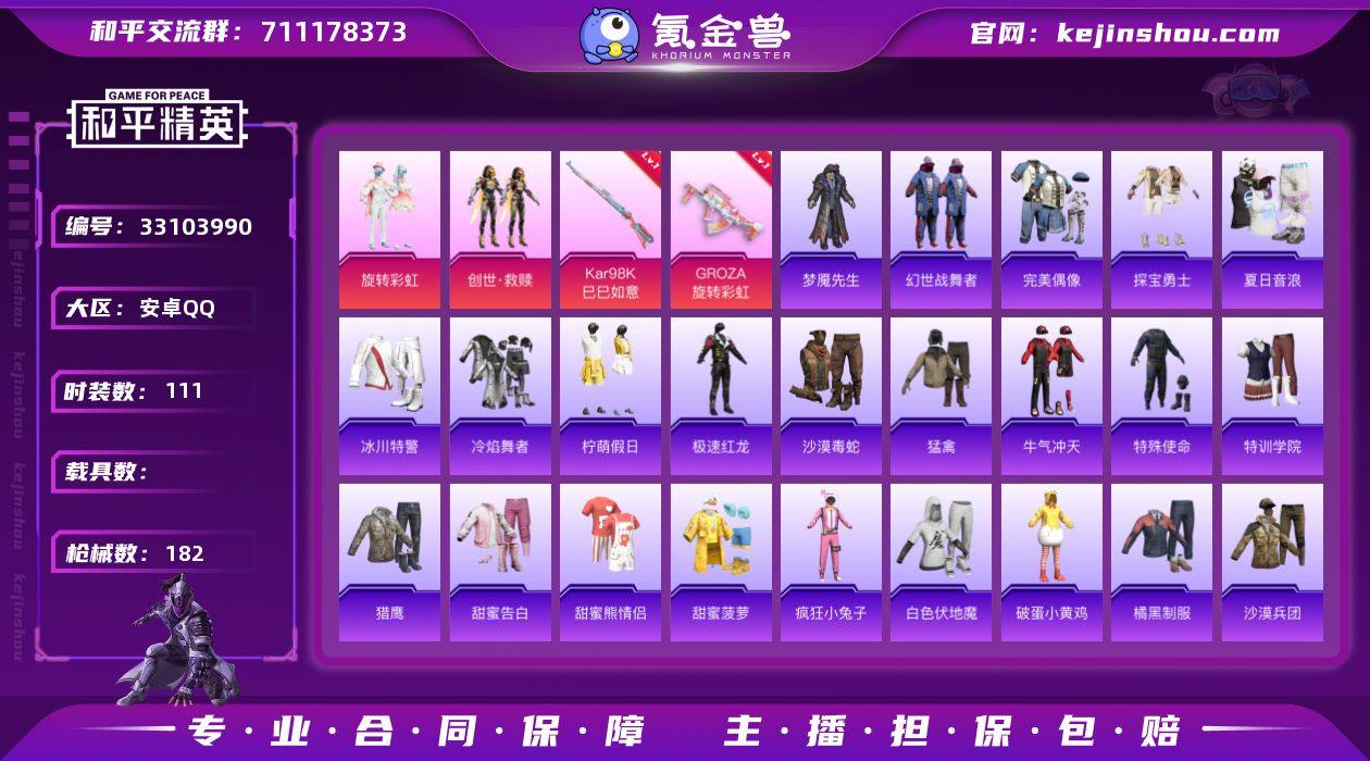 HM6839一体号-安卓Q区-3粉4特效2飞行器 地铁天赋 王者110皮至尊宝3传说1星元【可二次 GROZA-旋转彩虹7级 红眼罩(暗影哥特) 军刀-雅典娜 枫露凝珀 樱梦幻音 送王者110皮至尊宝3传说1星元】-51223热力值-1王牌印记-132套装-182枪皮-铂金I-游戏58级 【优质套装】: 鸢尾珑雾 旋转彩虹 创世·救赎 【特效枪等级】:Kar98K-巳巳如意(五级- Kar98K-巳巳如意)GROZA-旋转彩虹(七级- GROZA-旋转彩虹) 【优质武器皮肤】: Kar98K-巳巳如意 GROZA-旋转彩虹 【稀有武器皮肤】: DBS-乌木金纹 SCAR-L-海盐豹豹 GROZA-海盐豹豹 Kar98K-巳巳如意 蝎式手枪-金丰海韵 Mk14-冰河战士 UZI-冰河战士 M16A4-冰河战士 20-H-乌木金纹 GROZA-旋转彩虹 PKM-紫幽梦 Mk14-紫幽梦 蜜獾-乌木金纹 S1897-紫幽梦 P92-紫幽梦 M416-红色方程式 M416-蓝色火焰 M416-糯团青竹 M416-圣诞惊喜 AKM-环太平洋 AKM-夜灯 AKM-生命誓言 AKM-破晓战魂 AKM-龙的传人 AKM-虎虎生威 AKM-萌趣颜团子 AKM-霓虹街区 SCAR-L-红色方程式 SCAR-L-玉兔迎春 SCAR-L-暗夜玫瑰 SCAR-L-夜灯 SCAR-L-炫彩节奏 M16A4-快乐主宰 M16A4-红色方程式 M16A4-蓝色火焰 M16A4-幻世战舞者 M16A4-甜心亚梦 GROZA-田园牧歌 AUG-耀粉歌者 AUG-2P战斗...