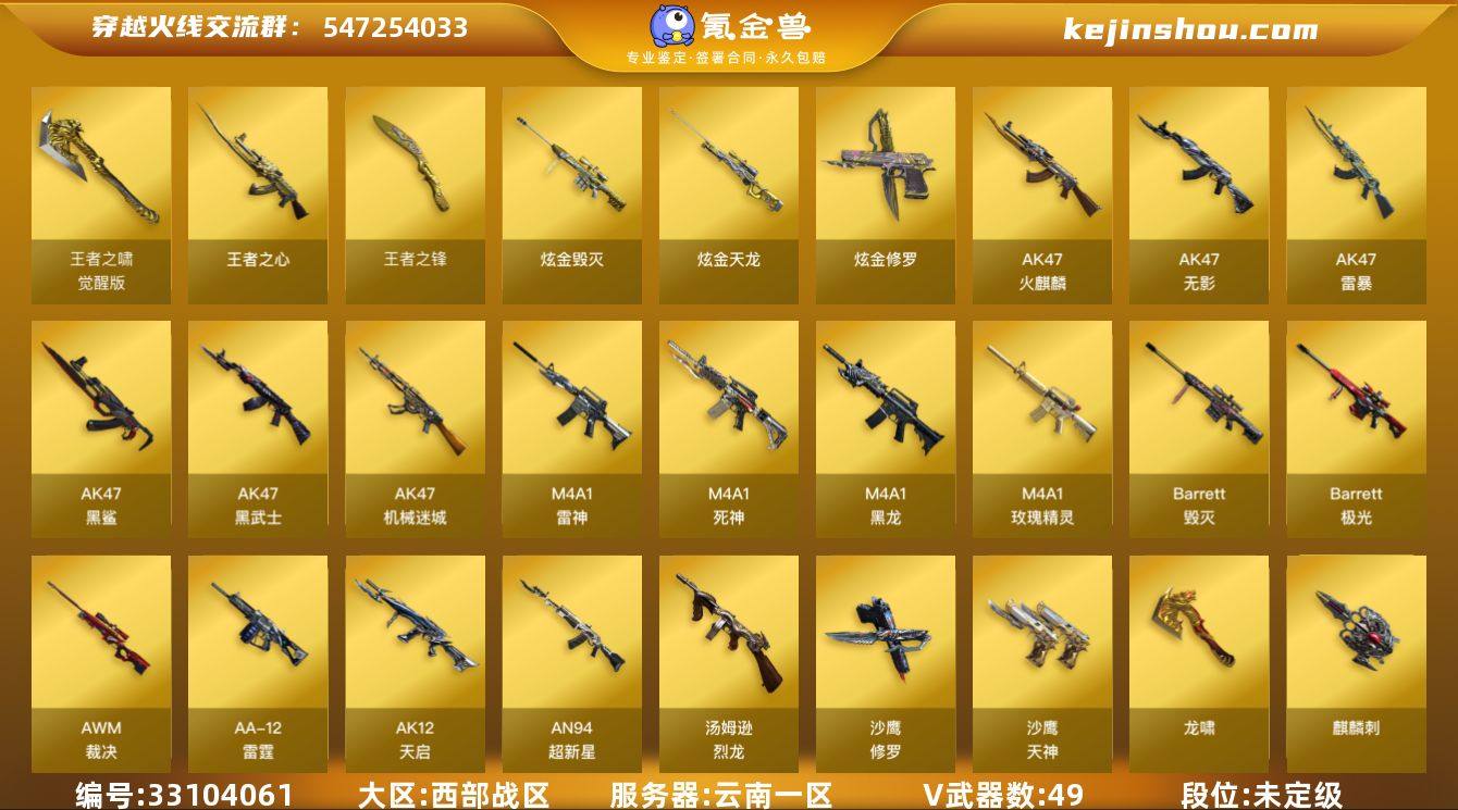 云南一区-52V-5王者武器数-3炫金武器数 【热门武器】:汤姆逊-烈龙*2,加特林-炼狱,USP-雷暴,沙鹰-修罗*3 【王者炫金武器】:王者之心,王者之锋*2,炫金毁灭,炫金天龙,炫金修罗 【皮肤】:雷神-暗月,雷神-能量核心,火麒麟-雷神,黑龙-能量核心,黑龙-暗月,M4A1-黑龙-361,无影-能量核心,无影耀金皮肤,天启-暗月,极光-能量核心 【角色】:魅影,兰-海滩派对,兰-新年限定,潘多拉-X,潜龙队-X,影武者-X 【人偶武器】:迷你深渊冰龙*3,夺魂,深渊终结者手雷 【挑战大师】:神圣爆裂者III,AK47-冰龙粉碎者,激光毁灭者III,阐释者III 【英雄级武器】:AK47-火麒麟*3,M4A1-黑龙,M4A1-雷神,AK47-无影,M4A1-死神,AK47-黑武士,AK12-天启,AN94-超新星*2,AK47-机械迷城,AK47-黑鲨,AK47-雷暴,M4A1-玫瑰精灵,AK-47-猩红传说*2,Barrett-毁灭,Barrett-极光,AWM-裁决,王者之光-觉醒版,加特林-炼狱,汤姆逊-烈龙*2,AA-12-雷霆,沙鹰-修罗*3,沙鹰-天神,USP-雷暴,龙啸,擎天*2,麒麟刺,斩神刀-雷暴,王者之啸-觉醒版,高爆手雷-雷暴*5,闪光弹-雷暴*5,烟雾弹-雷暴*5 【道具】:战舰背包,炫彩背包,超级背包,妩媚妖姬,夺命之镰,防化服,防弹头盔*3,防...
