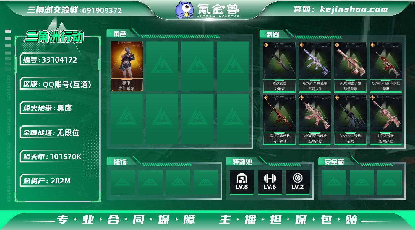 【sjs10569】可二次 玩够能回血 1红皮维什戴尔 sjs10569 202m总资产-101570k哈夫币-60烽火等级-黑鹰-1战场等级-无军衔 【干员外观】:骇爪-维什戴尔 【近战皮肤】:近战-处刑者1级,近战-黑鹰 【传说外观】:M4A1突击步枪-阿米娅,AKM突击步枪-锦绣,AUG突击步枪-悠然茶歇,SCAR-H战斗步枪-启航,SCAR-H战斗步枪-荼蘼,CAR-15突击步枪-阿米娅,腾龙突击步枪-马年祥瑞,K437突击步枪-锦绣,MK47突击步枪-悠然茶歇,Vector冲锋枪-夜莺,UZI冲锋枪-悠然茶歇,SMG-45冲锋枪-锦绣,SR-3M紧凑突击步枪-荼蘼,QCQ171冲锋枪-不羁人生,MK4冲锋枪-夜莺,PKM通用机枪-荼蘼,Mini-14射手步枪-夜莺,M14射手步枪-电锯惊魂,R93狙击步枪-维什戴尔,G18-马年祥瑞 【史诗外观】:AKM突击步枪-林中猎手,M16A4突击步枪-竞赛选手,AUG突击步枪-蝮蛇,SG552突击步枪-深海恐惧,SG552突击步枪-哈夫克警备,SCAR-H战斗步枪-囚徒,腾龙突击步枪-猎鳄行动,腾龙突击步枪-聚光灯,MP5冲锋枪-战术竞备,MP5冲锋枪-竞技风,SMG-45冲锋枪-阿萨拉特攻,SR-3M紧凑突击步枪-战术竞备,勇士冲锋枪-工业狂潮,MP7冲锋枪-六套之力,M1014霰弹枪-林中猎手,QJB201轻机枪-炽焰,SVD狙击步枪-暗夜猎手,M14射手步...