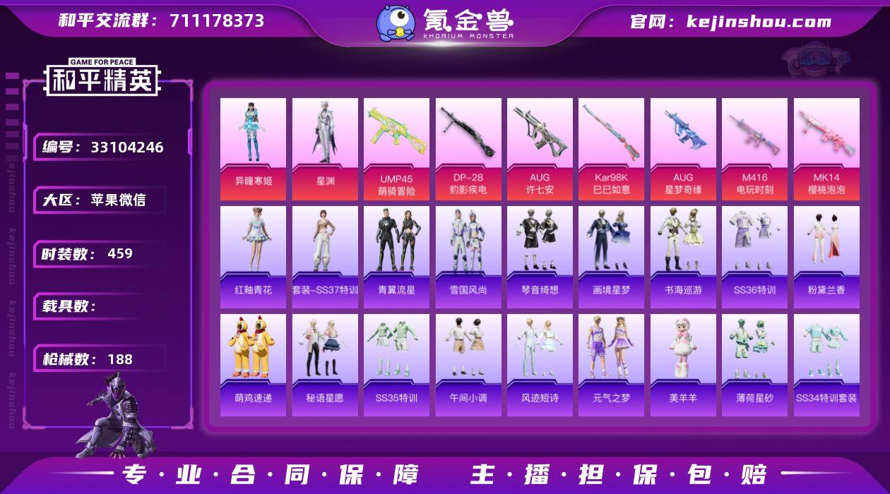 AL696072 【特价苹果v区微信永久社交 游戏号 高等级星梦 6级AUG-星梦奇缘】 热力值55508 枪皮数量188 粉装数2 套装数量126 时装数459 战备数127 其他武器皮肤175 头盔83 动作41 伙伴5 其他武器皮肤:GROZA-海盐豹豹,GROZA-福马献瑞,GROZA-乌木金纹,GROZA-紫矿核心,M16A4-雨过天青,M16A4-幻世战舞者,M16A4-冰河战士,蜜獾-风迹短诗,蜜獾-娇憨猪猪,蜜獾-乌木金纹,蜜獾-天降萌叽,蜜獾-糖糖葫芦,AUG-紫晶流影,AUG-冰晶雪宝,AUG-乌木金纹,AUG-异域银装,AUG-天降萌叽,SCAR-L-星途旅人,SCAR-L-炫彩节奏,SCAR-L-玉兔迎春,SCAR-L-彩虹符号,SCAR-L-海盐豹豹,SCAR-L-红色方程式,QBZ-纯真浪花,QBZ-乌木金纹,QBZ-彩虹符号,M416-蓝色火焰,AKM-霓虹街区,AKM-霓彩脉冲,AKM-彩虹符号,AKM-破晓战魂,AKM-虎虎生威,AKM-涂鸦街区,M762-瑞龙福将,M762-彩虹符号,AC-VAL-天降萌叽,ACE32-冰晶雪宝,ACE32-画境星梦,G36C-乌木金纹,Mk47-风迹短诗,Mk47-乌木金纹,Famas-霓彩脉冲,ARX-凌霄紫焰,AWM-纯真浪花,AWM-焰鹰斗篷,AMR-雨过天青,AMR-鸡智如我,AMR-喜羊羊与灰太狼,莫辛纳甘-风迹短诗,莫辛纳甘-乌木金纹,Mini14-乌木金纹,Win94-瑞龙福将,M200-乌木...