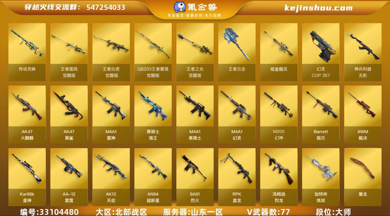 【ky6438】山东一区-86V-5王者武器数-1炫金武器数 【传说武器】:传说灵眸 【热门武器】:传说灵眸,M14EBR-玄武,M200-幻神,M200-竞技荣光,死亡之眼,荣耀世冠-火麒麟,荣耀世冠-雷神,荣耀世冠-柯尔特,Kar98K-星神,金色小号,Cat-刀锋,M4A1-黑骑士,汤姆逊-烈龙,RPK-盘龙*6,加特林-炼狱*2,COP 357-幻灵*2,荣耀世冠-龙啸 【王者炫金武器】:王者云击,炫金毁灭 【音效卡】:M4A1-黑骑士音效卡,Kar98K-星神音效卡 【皮肤】:雷神-耀金皮肤,雷神-R.LGD-CFPLS18冠军,雷神-15周年嘉年华 皮肤,火麒麟-QQ会员,毁灭-冠军之怒,毁灭-战神张飞,M4A1-千变-孔明皮肤,烈火-熔核皮肤,AWM-天龙-传奇白鲨,炼狱-星空,屠龙-QQ会员 【角色】:影豹,电竞教官-云悠悠,隼,星际战将,战地猎狐,王者-救世主,王者潘多拉,修道士,云海玲珑,电竞少女,风暴女*2,嘉年华灵狐,兰-梨园特工,零-热舞青春,曼陀罗-X,萌儿,潘多拉-甜心教官,青霞仙子,樱-战斗天使 【人偶武器】:火麒麟-灵狐,AWM-灵狐-15周年嘉年华,Cat-刀锋,生化手雷-机甲核心 【暴走生化】:死亡之眼,超级对讲机 【挑战大师】:神圣爆裂者-末日III 【英雄级武器】:AK47-火麒麟,M4A1-雷神,M4A1-黑骑士...
