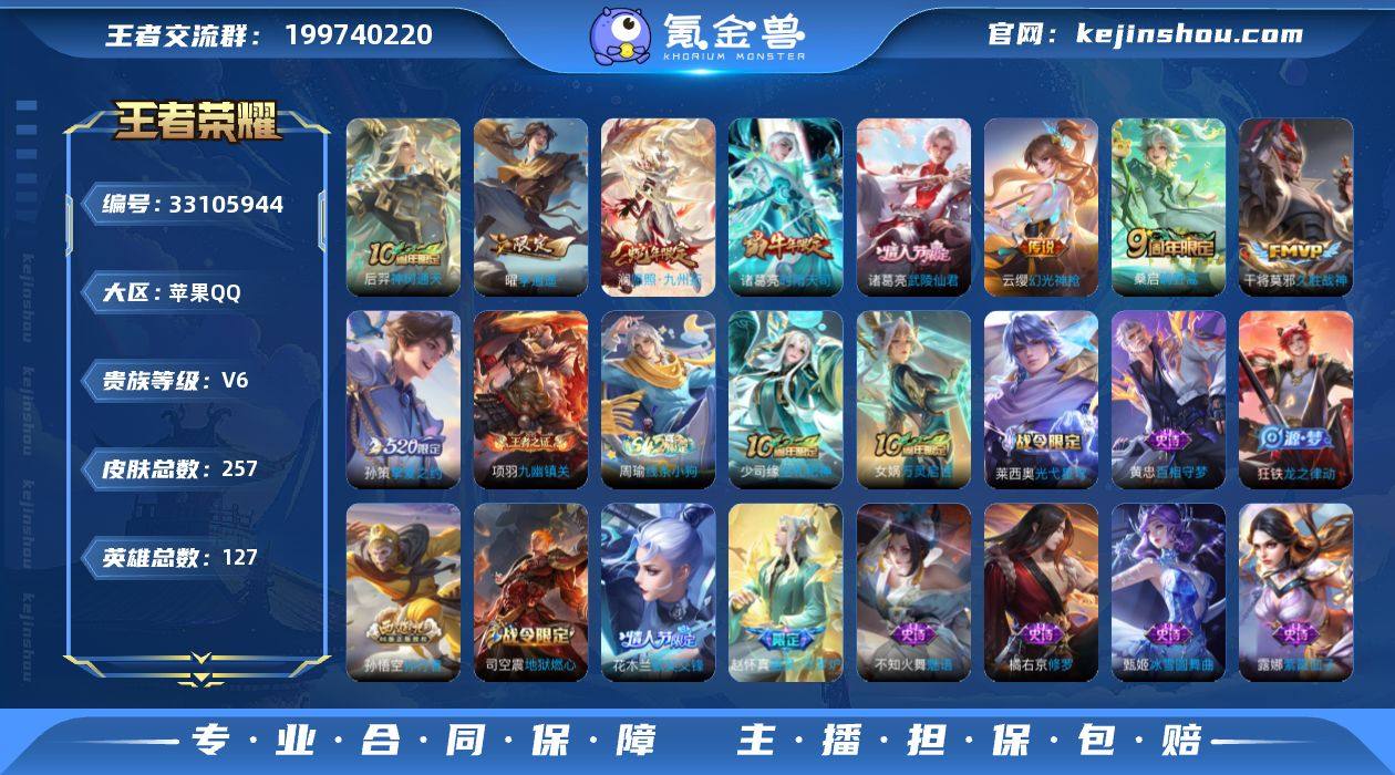 苹果Q-V6-永恒钻石V段位-127英雄-257皮肤-9传说-66史诗 【英雄全皮】:孙权全皮,空空儿全皮,影全皮 【传说皮肤】:后羿神树通天,澜愿照九州拓,云缨幻光神枪,桑启鸣野蒿,孙策挚爱之约,曜李逍遥 ,诸葛亮时雨天司,干将莫邪久胜战神,诸葛亮武陵仙君 【限定皮肤】:虞姬夏日便利店,姜子牙天穹之誓,狄仁杰阴阳师,赵云皇家上将,墨子神迹守卫,孙尚香蔷薇恋人,高渐离玩趣恶龙,扁鹊奇幻香踪,元歌无心,夏侯惇朔风刀,曹操烛龙,典韦穷奇,狄仁杰魔术师,狄仁杰万华元夜,达摩星际陆战队,项羽海滩派对,老夫子醍醐杖,老夫子航海奇遇记,程咬金演武夺筹,韩信逐梦之影,兰陵王金庭之子,花木兰默契交锋,孙悟空孙行者,牛魔御旌,李元芳云中旅人,钟馗驱傩正仪,杨玉环遇见飞天,杨戬潮玩骑兵,干将莫邪胡桃夹子,雅典娜黎明之约,蔡文姬繁星吟游,太乙真人饕餮,鬼谷子原初探秘者,鬼谷子五谷丰年,诸葛亮武陵仙君,诸葛亮时雨天司,弈星混沌棋,明世隐疑决卦,裴擒虎李小龙,裴擒虎擒涛扼浪,米莱狄胡桃异想国,云中君纤云弄巧,盾山御銮,孙策挚爱之约,上官婉儿梁祝,嫦娥拒霜思,曜李逍遥 ,鲁班大师探海日志,桑启海盐诗旅,艾琳流音漫舞,司空震地狱燃心,阿古...