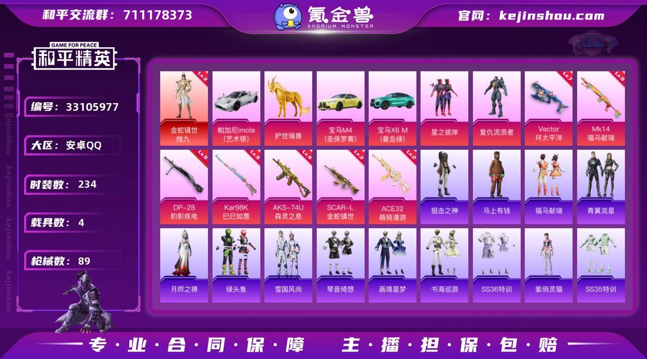 实名: 可修改 时装数: 234 载具数: 4 枪械数: 89 战备数: 4 神级装扮: 金蛇镇世-烛九 热门装扮: 星之彼岸,复仇流浪者 载具: 帕加尼imola(艺术银),宝马X6 M(曼岛绿),宝马M4(圣保罗黄),护世瑞兽 稀有枪皮: Vector环太平洋,Kar98K-巳巳如意,SCAR-L金蛇镇世,DP-28-豹影疾电,AKS-74U-森灵之息,MK14-福马献瑞,ACE32-萌骑漫游 亮点: 【优质装备】:金蛇镇世-烛九,三级金蛇镇世-烛九,8号机(新粉螳螂),七级Vector-环太平洋