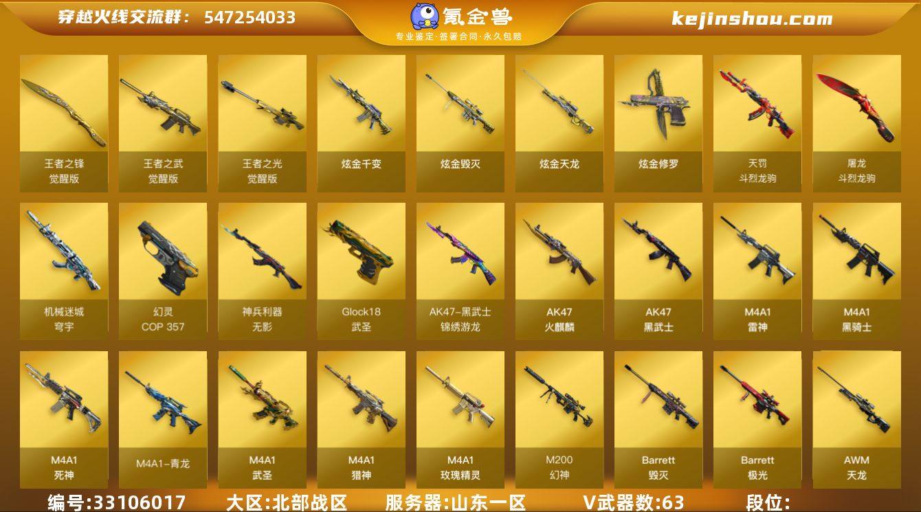 北部战区(山东一区)ys【爆破冲锋号】63v【M200-幻神+双皮/AG-CFPLS24冠军/荣耀世冠白鲨,武圣套装,斗烈龙驹套装,动感闪耀套装,QBZ03-金色蔷薇+皮/荣耀世冠白鲨,Barrett-毁灭,COP-幻灵,修罗-斗烈龙驹,Colt1911-大黄蜂,胡萝卜匕首】4王者【王者之武,王者之光,王者之锋,超新星-悦享】5炫金【炫金千变,炫金毁灭,炫金天龙,炫金修罗】6角色【葵,太空指挥官,斗烈龙骑,奇洋探员,乔伊教练,云海玲珑,卡塔琳娜】7音效【M4A1-雷神音效卡,M4A1-黑骑士音效卡,Barrett-毁灭音效卡,Barrett-极光音效卡,HK417-星闪朱雀音效卡,天罚-斗烈龙驹-斗烈音效卡,屠龙-斗烈龙驹-斗烈音效卡】27皮【幻神-AG-CFPLS24冠军,幻神-荣耀世冠白鲨,QBZ03-荣耀世冠白鲨,黑骑士-摸金校尉,擎天-冠军之击,M4A1-战神赵云,毁灭-战神张飞,火麒麟-心动糖果,毁灭-神秘黑洞,毁灭-星空,烈龙-星空,黑骑士-幻能朋克,雷神-虎将,毁灭-冠军之怒,修罗-冠军之魂,雷神-冠军之魄】 截图展示段位不代表实际段位 如赛季更新等不可抗拒因素发生变化、时限道具不保证所剩时间