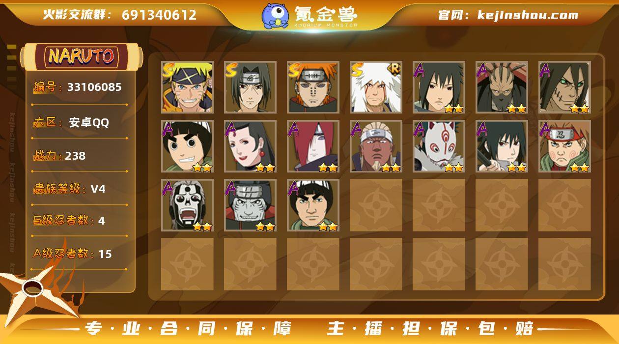 DHY785安卓Q【区服】4166【等级】126【S级数量】4【A级数量】15 【S级】宇智波鼬「须佐能乎」 自来也「舞之豪杰」 佩恩「天道」 漩涡鸣人·宇智波佐助 【A级】李洛克「忍界大战」 秋道丁次「忍界大战」 波风水门「青年」 角都「秽土转生」 干柿鬼鲛 宇智波泉奈 迈特凯「青春爆炸」 蝎 艾「青年」 不缘 神秘面具男「忍者之路」 长门「青年」 迈特凯 飞段「死司凭血」 宇智波佐助「须佐能乎」 【B级】宇智波佐助「疾风传」 君麻吕 野原琳「漂泊浪客」 佩恩「饿鬼道」 春野樱「忍者少女」 月光疾风「秽土转生」 佩恩「地狱道」 鬼灯满月「忍刀七人众」 春野樱「疾风传」 君麻吕「咒印」 惠比寿 漩涡鸣人「疾风传」 御手洗红豆「新春限定」 鬼灯水月 漩涡玖辛奈 木叶丸「疾风传」 天天「疾风传」 宇智波鼬「暗部」 萨姆伊「忍界大战」 日向雏田「疾风传」 佐井「最终章」 御手洗红豆 雨琉「羁绊」 【C级】日向花火 漩涡鸣人 日向雏田 手鞠 秋道丁次 手鞠「镰多利」 萨克镫 多由也 勘九郎 神月出云 左近右近「秽土转生」 天天 春野樱 油女志乃 山中井野 鬼童丸 宇智波佐助 奈良鹿丸 犬塚牙 静音 李洛克 春野樱「忍者新秀」 漩涡鸣人「忍者学员」 伊豆野山葵 左近右近 多由也「秽土转...