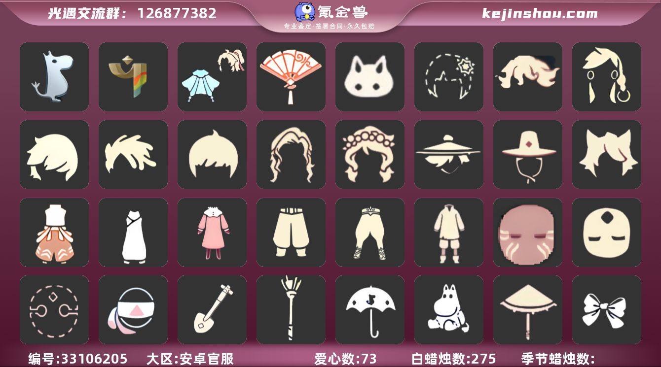 编号AY471-471 安卓手机 换绑CD4.30 详情请看衣柜截图 蜡烛数:275 爱心数:73 季节已毕业:姆明季 彩染季 珍稀物品:无 完成地图:无 礼包:兔子 雪花 青衫落拓礼包 献瑞折扇礼包 裤子:乞丐裤 姆明季·裤子 妮妮裙子 彩染挑衅艺伎裤子 灯笼裤 武士裤 鞋子:布鞋 姆明季·鞋子 彩染挑衅艺伎鞋子 寻宝长靴 面具:矮人面具 白色条纹面具 黑脸 面饰:蒙眼面巾 发型:正太 脏辫发型 明制 若笠 花环 斜刘海发型 虚荣 吊环双辫发型 猫耳 帽匠绅士发型 头饰:羽毛装饰 黄色蝴蝶结 红耳机 斗篷:白斗 白金 三色斗篷 半边围巾斗篷 遥鲲短斗篷 小熊猫分体斗篷 姆明季·斗篷 圣诞斗 配饰:雨伞 小红伞 寻宝铲 集结季火炬 姆明抱枕 用户最高身高:2.39439 用户最矮身高:14.39439 用户当前身高:2.58276