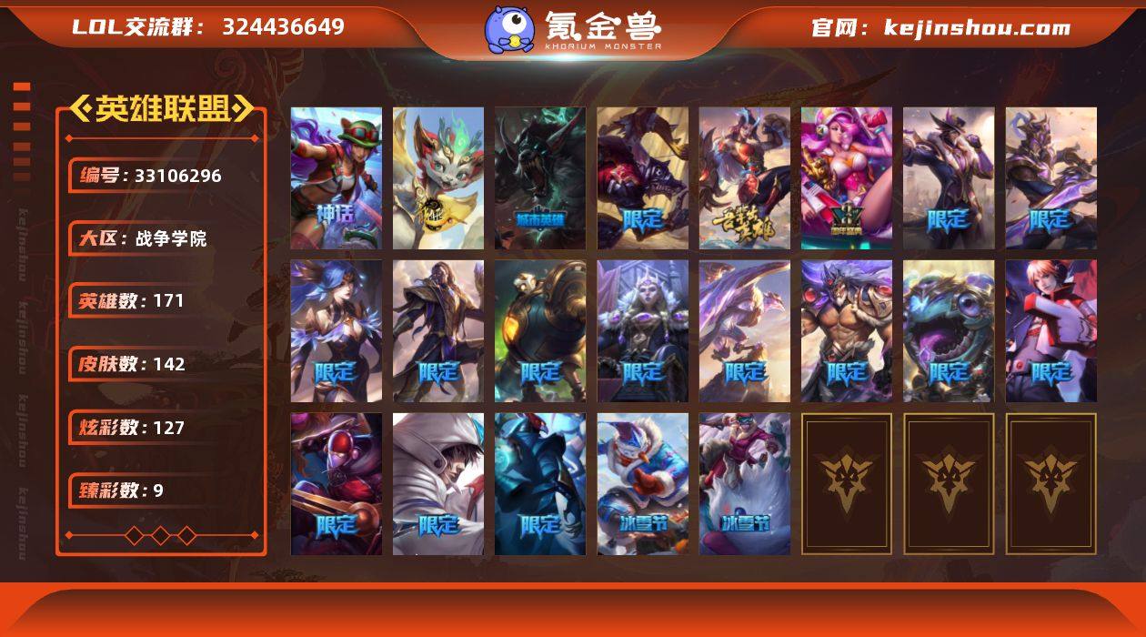 【皇冠号 】未定级段位-171英雄-142皮肤-127炫彩-0终极-2神话-24限定-18传说-23史诗 【神话皮肤】:十五周年纪念希维尔,神凰行者瑞羽圣凰艾尼维亚 【臻彩皮肤】:无畏骑士瑟庄妮赤子初心,吕布奉先炫金战神,征服者韦鲁斯炫金,星之守护者金克丝黑洞,幻灵战斗蝠薇恩梦幻强袭,玉剑传说寒潭夭夭胭脂,可爱可爱粉红红布里茨,魔女阿卡丽虚荣,黑夜使者嘉文四世白夜 【年限皮肤】:天龙之子斯莫德 【冰雪限定】:持胡萝卜的雪人易,魄罗骑士瑟庄妮 【限定皮肤】:暗杀星伊泽瑞尔,SKTT1劫,SSW泰隆,SKTT1阿兹尔,电玩女神厄运小姐,暗裔英雄盖伦,胜利枪神卢锡安,胜利机器人布里茨,胜利女神瑟庄妮,胜利凤凰艾尼维亚,胜利之王泰达米尔,胜利巨口克格莫,胜利女神娑娜,胜利剑圣易,胜利之运崔斯特,胜利女神菲奥娜,不给糖就捣蛋艾克,暗影沃里克,都铎王朝图奇,玉剑传说舞龙卫 【传说皮肤】:铁哥们儿奥拉夫,地狱之门卫士加里奥,源计划林易,约德尔国队长提莫,女皇艾希,战地巨兽科加斯,冰霜之刃艾瑞莉娅,冰川巨兽墨菲特,源计划泯灭雷克顿,源计划净化薇恩,战斗学院伊泽瑞尔,黯黑魔龙希瓦娜,苍穹之光韦鲁斯,宇航员诺提勒斯,星之守护者卡莎,黑夜使者亚索,星...