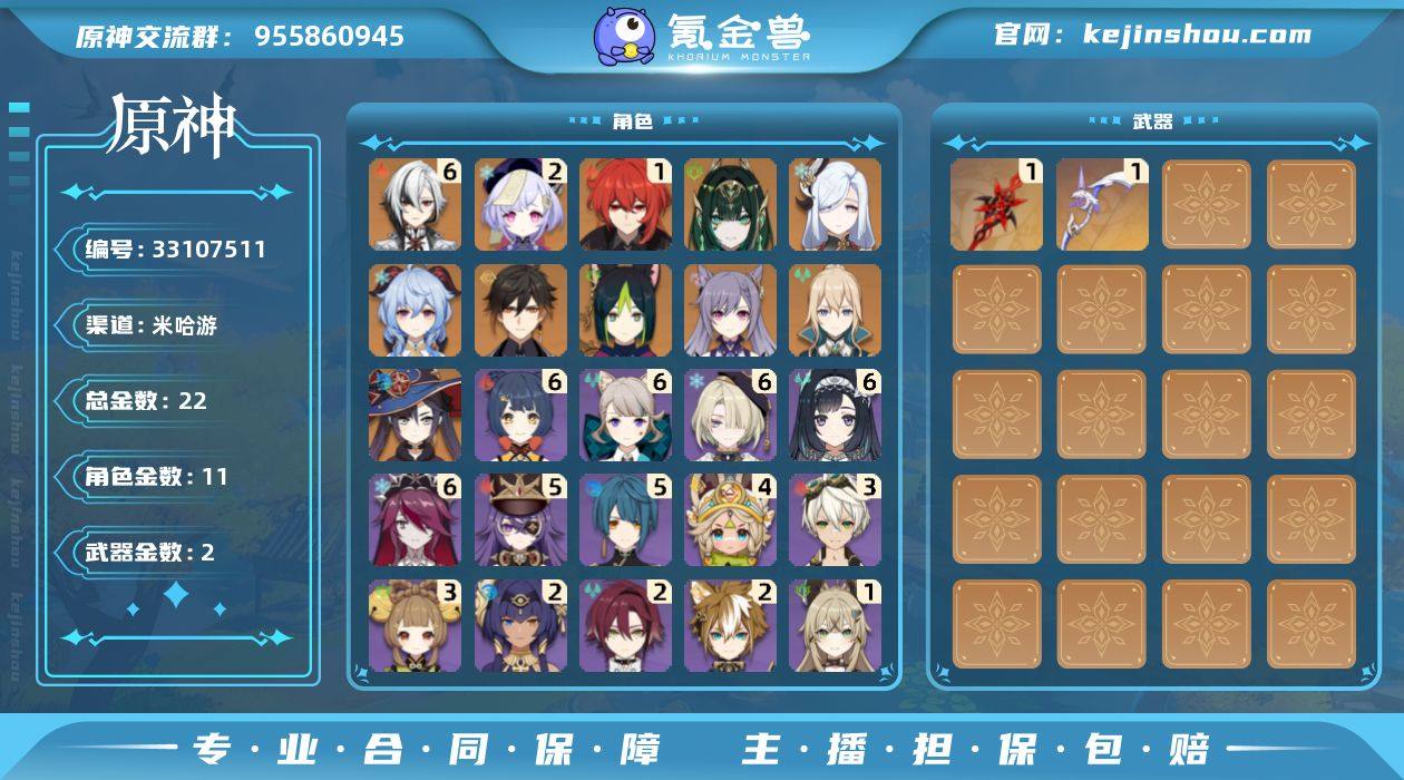 邮箱: 不送邮/死邮 总黄数: 22 冒险等级: 57 6命金色角色: 满命阿蕾奇诺 2命金色角色: 二命七七 1命金色角色: 一命迪卢克 0命金色角色: 刻晴,钟离,莫娜,琴,甘雨,申鹤,提纳里,奈芙尔 拥有武器: 阿莫斯之弓,赤月之形 1精武器: 阿莫斯之弓,赤月之形