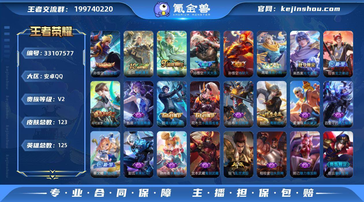 安卓Q-V2-永恒钻石II段位-125英雄-123皮肤-1典藏皮肤-4传说-19史诗 【荣耀典藏】:孙悟空全息碎影 【传说皮肤】:后羿神树通天,桑启鸣野蒿,孙悟空齐天大圣,孙悟空地狱火 【限定皮肤】:姜子牙天穹之誓,狄仁杰阴阳师,虞姬凯尔特女王,赵云皇家上将,孙膑妖精王,扁鹊炼金王,芈月重明,夏侯惇朔风刀,曹操烛龙,典韦穷奇,马可波罗山海玄木吟,达摩沙漠行僧,项羽海滩派对,老夫子醍醐杖,孙悟空齐天大圣,钟馗驱傩正仪,蔡文姬繁星吟游,苏烈千军破阵,弈星混沌棋,沈梦溪大漠名商,鲁班大师探海日志,桑启海盐诗旅,张良古海寻踪,鬼谷子天穹祈灯,沈梦溪龙舞盛年,刘邦剑破天穹,周瑜熔金海岸 【年限皮肤】:马可波罗山海玄木吟 【赛季限定】:孙膑妖精王,扁鹊炼金王,虞姬凯尔特女王,曹操烛龙,芈月重明,典韦穷奇,夏侯惇朔风刀,弈星混沌棋,老夫子醍醐杖,钟馗驱傩正仪,苏烈千军破阵,达摩沙漠行僧,沈梦溪大漠名商,桑启海盐诗旅,鲁班大师探海日志,张良古海寻踪,鬼谷子天穹祈灯,刘邦剑破天穹,姜子牙天穹之誓,东皇太一噬灭天穹,太乙真人谧流熔炉,钟馗虚灵犬护,亚瑟荣光之誓 【战令限定】:莱西奥光弋星穹,明世隐往忆晖光,周瑜线条小狗 【史诗皮肤】...