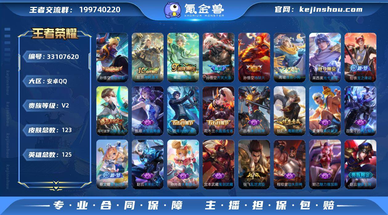 安卓Q-V2-永恒钻石II段位-125英雄-123皮肤-1典藏皮肤-4传说-19史诗 【荣耀典藏】:孙悟空全息碎影 【传说皮肤】:后羿神树通天,桑启鸣野蒿,孙悟空齐天大圣,孙悟空地狱火 【限定皮肤】:姜子牙天穹之誓,狄仁杰阴阳师,虞姬凯尔特女王,赵云皇家上将,孙膑妖精王,扁鹊炼金王,芈月重明,夏侯惇朔风刀,曹操烛龙,典韦穷奇,马可波罗山海玄木吟,达摩沙漠行僧,项羽海滩派对,老夫子醍醐杖,孙悟空齐天大圣,钟馗驱傩正仪,蔡文姬繁星吟游,苏烈千军破阵,弈星混沌棋,沈梦溪大漠名商,鲁班大师探海日志,桑启海盐诗旅,张良古海寻踪,鬼谷子天穹祈灯,沈梦溪龙舞盛年,刘邦剑破天穹,周瑜熔金海岸 【年限皮肤】:马可波罗山海玄木吟 【赛季限定】:孙膑妖精王,扁鹊炼金王,虞姬凯尔特女王,曹操烛龙,芈月重明,典韦穷奇,夏侯惇朔风刀,弈星混沌棋,老夫子醍醐杖,钟馗驱傩正仪,苏烈千军破阵,达摩沙漠行僧,沈梦溪大漠名商,桑启海盐诗旅,鲁班大师探海日志,张良古海寻踪,鬼谷子天穹祈灯,刘邦剑破天穹,姜子牙天穹之誓,东皇太一噬灭天穹,太乙真人谧流熔炉,钟馗虚灵犬护,亚瑟荣光之誓 【战令限定】:莱西奥光弋星穹,明世隐往忆晖光,周瑜线条小狗 【史诗皮肤】...