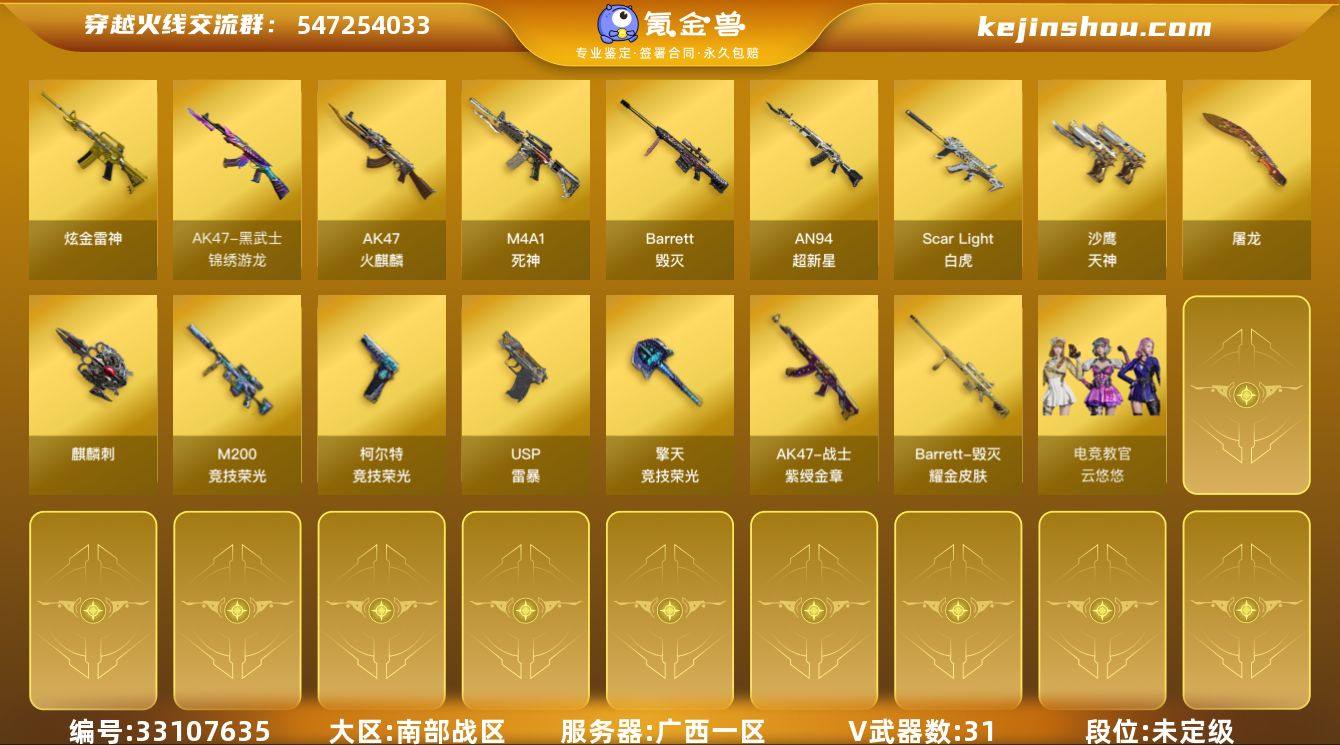 广西一区-35V-2王者武器数-1炫金武器数 【热门武器】:Scar Light-白虎,M200-竞技荣光,Kar98K-星神,牛牛-AK47,雷神-小红,USP-雷暴,金刚伞 【王者炫金武器】:王者冰锋,炫金雷神 【音效卡】:Kar98K-星神音效卡 【皮肤】:毁灭耀金皮肤,毁灭-英雄计划 皮肤,战神-紫绶金章皮肤 【角色】:电竞教官-云悠悠,战地猎狐,王者-瞳-闭月羞花,初恋灵狐,风暴女,龙儿,兔囡囡,游珑儿,智影,团团 【人偶武器】:雷神-小红,牛牛-AK47,迷你牛牛,生化手雷-机甲核心 【挑战大师】:冰龙粉碎者-白马银枪 【英雄级武器】:AK47-火麒麟,M4A1-死神,AN94-超新星,Scar Light-白虎,黑武士-锦绣游龙,Barrett-毁灭,Kar98K-星神,M200-竞技荣光,沙鹰-天神*2,USP-雷暴,柯尔特-竞技荣光*2,屠龙,麒麟刺,擎天-竞技荣光,王者之锋-觉醒版,高爆手雷-竞技荣光*5,闪光弹-雷暴,闪光弹-竞技荣光,烟雾弹-雷暴,烟雾弹-竞技荣光*7,M4A1-赤狱骑士 【其他武器】:源·火麒麟*2,魂·火麒麟-百城,源·雷神*2,魂·M4A1-雷神-化蛇,魂·雷神-诺拉,魂·雷神-新春神龙,魂·雷神-萌柴,御·雷神-机甲刑天*2,御·雷神-烈虎,雷神-赛博幻想,魂·黑骑士-摸金校尉,魂·黑骑士-现代金属,魂·黑骑士-...