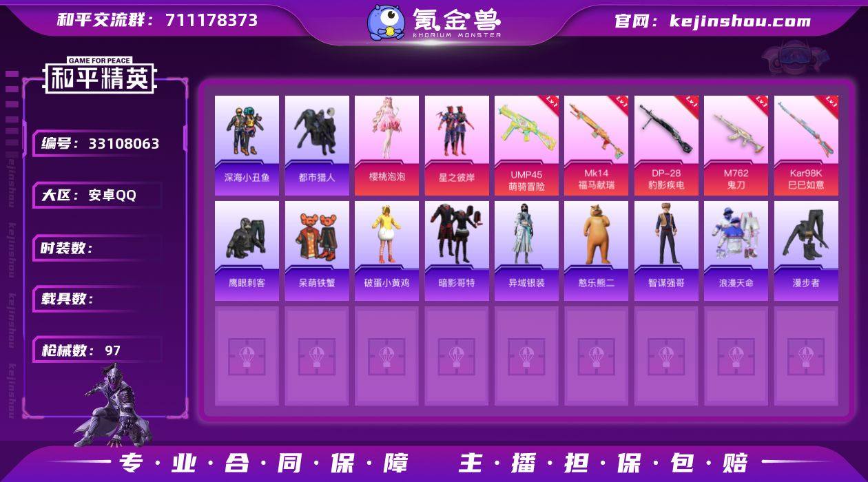 XS11527【可二次 2粉装-6特效枪 浪漫天命,都市猎人,深海小丑鱼,暗影哥特 小雾神】安卓手Q-2粉装-6特效枪-74套装-97枪皮-5王牌印记-不朽星钻Ⅲ-26781热力值【2粉装】角色-樱桃泡泡,星之彼岸【6特效枪】Kar98K-巳巳如意[5级],Mk14-福马献瑞[5级],DP-28-豹影疾电[5级],M762-鬼刀[6级],UMP45-萌骑冒险[4级],AKS-74U-森灵之息[5级]【4稀有】浪漫天命,都市猎人,深海小丑鱼,暗影哥特【6飞行器】招财竹蜻蜓飞行器,狂鲨锋刃飞行器,异域银装飞行器,马上有福飞行器,炫彩糖果飞行器,粉色滑翔尾迹【159其它衣服和枪皮】漫步者,SS37特训,阳光火鸡,玲珑侠影,幻世战舞者,森林游猎者,战术大师,雨过天青,角色-绯色魅影,旭日情侣,恋语绒绒,音速流光,SS33特训,鹰眼刺客,完美偶像,竞技名士,SS38特训,SS36特训,玩偶服-憨乐熊二,雪国风尚,魅力单车,燕燕于飞,青翼流星,狂鲨锋刃,萌趣咩咩,王牌教练,冷焰舞者,闪电轻猫,红釉青花,特战装甲,鱼渊荷华,巳巳如意,酒红色名流,玩偶服-懒羊羊,呆萌铁蟹,元素星魂,异域银装,SS31特训,街头风暴,马上有钱,SS34特训,阳光菠萝,青玉碎影,智谋强哥,冰冻风暴,福马献瑞,战地督导,SS35特训,绒宝小鹅,海岛探路者,破晓战魂,狙击之神,长空猛禽,薄荷星砂,SS30特训,缤纷果语,SS32...