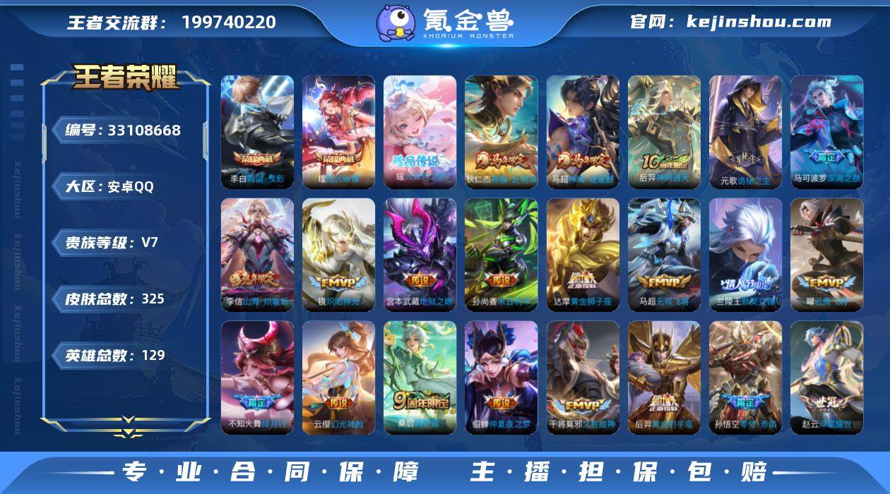 贵族等级: V7 英雄数: 129 皮肤数: 325 荣耀水晶: 鸣剑·曳影,拾光映像 珍品传说: 大耳狗之梦 传说皮: 黄金狮子座,黄金射手座,云鹰飞将,久胜战神,炽阳神光,末日机甲-孙尚香,仲夏夜之梦,零号·赤焰,地狱之眼,淬星耀世,无双飞将,山海·炽霜斩,幻光神枪,诡秘之主,神树通天,神骥·赴朔漠,神骥·逐星野 限定皮: 冰锋战神,李小龙,神威,飞衡,冰霜恋舞曲,逐梦之影,朱雀志,至尊宝,默契交锋-兰陵王,默契交锋-花木兰,深海之息,五谷丰年,绯月行,神器·万象笔,山海·碧波行,鸣野蒿,逐霄战戟