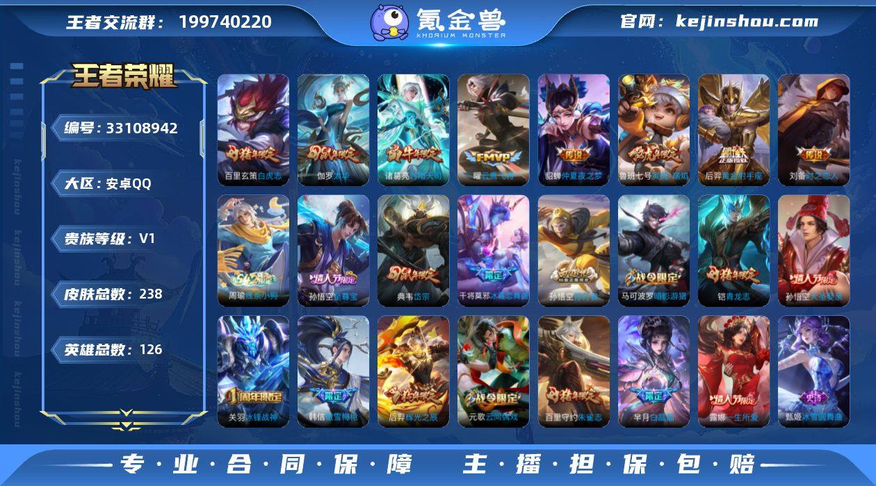 安卓Q-V0-尊贵铂金I段位-126英雄-238皮肤-1典藏英雄-8传说-57史诗 【英雄全皮】:刘邦全皮 【荣耀典藏】:武则天英雄 【传说皮肤】:鲁班七号寅虎瑞焰,诸葛亮时雨天司,曜云鹰飞将,刘备时之恋人,伽罗太华,百里玄策白虎志,后羿黄金射手座,貂蝉仲夏夜之梦 【限定皮肤】:白起狰,姜子牙天穹之誓,狄仁杰阴阳师,廉颇寅虎御盾,赵云皇家上将,赵云百木心枪,墨子神迹守卫,鲁班七号狮舞东方,鲁班七号寅虎瑞焰,庄周高山流水,高渐离玩趣恶龙,阿轲迷踪丽影,白起夜都怪侠,芈月重明,芈月白晶晶,芈月幻夜卜梦,吕布猎兽之王,元歌云间偶戏,甄姬游园惊梦,曹操烛龙,典韦穷奇,典韦岱宗,马可波罗暗影游猎,狄仁杰魔术师,狄仁杰万华元夜,达摩沙漠行僧,项羽海滩派对,项羽霸王别姬,老夫子醍醐杖,老夫子航海奇遇记,关羽冰锋战神,程咬金演武夺筹,露娜一生所爱,刘邦夺宝奇兵,韩信傲雪梅枪,兰陵王金庭之子,亚瑟潮玩骑士王,孙悟空至尊宝,孙悟空大圣娶亲,孙悟空孙行者,牛魔御旌,牛魔奔雷神使,后羿辉光之辰,后羿如梦令,李元芳云中旅人,虞姬霸王别姬,钟馗驱傩正仪,干将莫邪冰霜恋舞曲,太乙真人饕餮,鬼谷子原初探秘者,鬼谷子五谷丰年,诸葛亮时雨天司,...