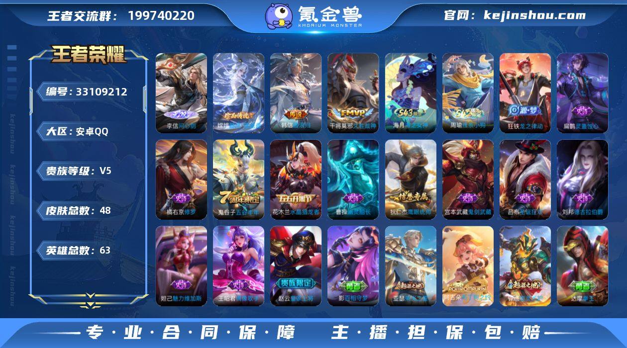 60英雄-45皮肤-v5/1无双/1珍品传说/2传说/12史诗/3稀有英雄【1 珍品传说】器灵·落星盏 嫦娥,【1 无双皮肤】问心剑 李信,【2 传说皮肤】久胜战神 干将莫邪,踏浪归 韩信,【12 史诗皮肤】德古拉伯爵 刘邦,五谷丰年 鬼谷子,鬼剑武藏 宫本武藏,线条小狗 周瑜,修罗 橘右京,魅力维加斯 妲己,偶像歌手 王昭君,灵蛊蚀心 扁鹊,龙之律动 狂铁,皇家上将 赵云,圣诞狂欢 吕布,幽灵船长 曹操,【20 勇者皮肤】拳王 达摩,白色死神 白起,黄金武士 典韦,阴阳师 狄仁杰,海滩派对 项羽,百相守梦 影,星际陆战队 程咬金,死亡骑士 亚瑟,兔女郎 花木兰,金庭之子 兰陵王,荣光之誓 亚瑟,万象初新 宫本武藏,时尚教父 姜子牙,教廷特使 韩信,云中旅人 李元芳,西部大镖客 孙悟空,布丁狗之约 阿古朵,命运角斗场 狂铁,虚灵犬护 钟馗,线条小狗 周瑜, 【12 其他皮肤】战争骑士 夏侯惇,灼热之刃 李信,海之征途 孙策,精灵王 后羿,激情绿茵 马可波罗,尼罗河女神 女娲,归虚梦演 曜,绝影神枪 百里守约,美梦成真 梦奇,圆桌骑士 太乙真人,西部大镖客 孙悟空,器灵·落星盏 嫦娥, 【3 稀有英雄】橘右京,娜可露露,韩信, 营地ID: