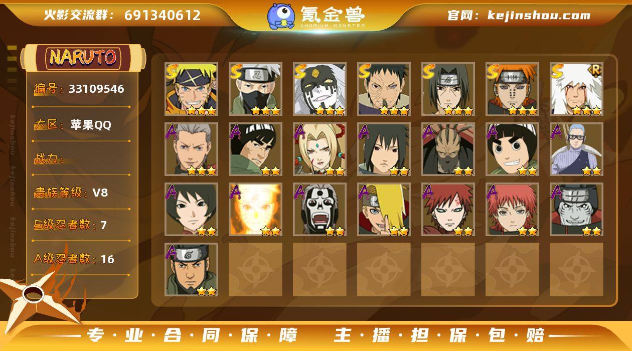 【编号15752 可秒换绑】【店长推荐!极品火影小号!带有破面带土和须佐能乎卡卡西,还有六代水影长十郞,再就是像传说自来也和十尾人柱力带土都即将抽出,赶快入手吧晚了就没了!!!!】 7S级忍者数-16A级忍者数 【S级忍者】:宇智波带土「忍界大战」(3星),宇智波鼬「须佐能乎」(3星),旗木卡卡西「须佐能乎」(3星),自来也「舞之豪杰」(3星),佩恩「天道」(3星),大筒木桃式(3星),漩涡鸣人·宇智波佐助(3星) 【A级忍者】:迪达拉(2星),飞段(3星),飞段「死司凭血」(2星),干柿鬼鲛(2星),漩涡鸣人「九尾查克拉」(2星),我爱罗「疾风传」(2星),蝎(2星),蝎「绯流琥」(2星),小南「神驹佑将」(2星),猿飞阿斯玛(2星),长十郎「六代目水影」(2星),李洛克「忍界大战」(2星),黑土「博人传」(2星),宇智波泉奈(2星),纲手「妖怪奇谭」(2星),迈特凯「青春爆炸」(2星)