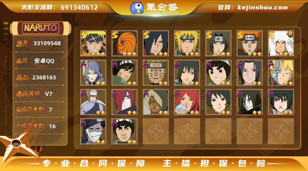 7S忍/16A忍/战力236W/V7/区服3223 【S忍者】 宇智波佐助「漩涡鸣人」,宇智波斑「五影会谈」,宇智波斑「秽土转生·解」,自来也「舞之豪杰」,宇智波鼬「须佐能乎」,佩恩「天道」,波风水门, 【A忍者】 小南「神驹佑将」,机械鸣人「初始形态」,迈特凯「青春爆炸」,长十郎「六代目水影」,漩涡博人「桃式显现」,宇智波鼬「夏日限定」,李洛克「忍界大战」,宇智波泉奈,长门「青年」,达鲁伊「五代目雷影」,不风,黑土「四代目土影」,大蛇丸「晓」,宇智波佐助「万花筒写轮眼」,迈特凯,桃地再不斩, PX_2549589