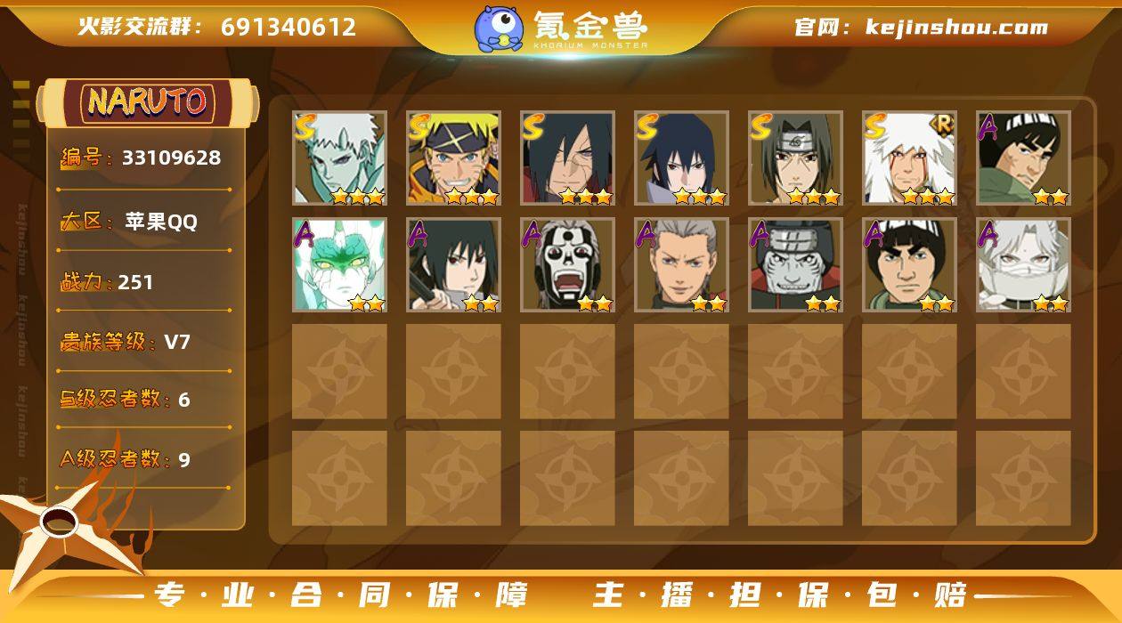 【HYSA1191】V7/战力251W/S忍6/A忍9/通灵兽13/三星S-自来也「舞之豪杰」/三星S-宇智波带土「十尾人柱力」/二星A-飞段「死司凭血」/三星S-宇智波佐助「永恒万花筒」/二星A-迈特凯/2星小南「神驹佑将」/二星A-飞段/三星S-漩涡鸣人·宇智波佐助/二星A-巳月「仙人模式」/二星A-干柿鬼鲛/三星S-宇智波斑「秽土转生·解」/二星A-迈特凯「青春爆炸」/二星A-宇智波佐助「须佐能乎」/二星A-卑留呼「火之意志继承者」/三星S-宇智波鼬 「须佐能乎」