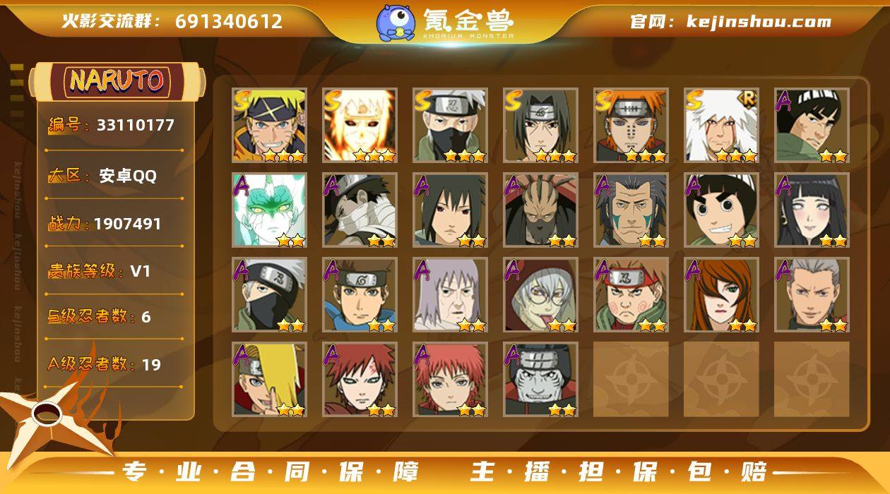 6S忍/19A忍/战力190W/V1/区服3545 【S忍者】 宇智波佐助「漩涡鸣人」,自来也「舞之豪杰」,旗木卡卡西「须佐能乎」,宇智波鼬「须佐能乎」,佩恩「天道」,波风水门「九喇嘛连结」, 【A忍者】 巳月「仙人模式」,迈特凯「青春爆炸」,日向雏田「最终章」,李洛克「忍界大战」,不动,蝎「绯流琥」,宇智波泉奈,桃地再不斩「秽土转生」,旗木卡卡西「忍界大战」,猿飞木叶丸「博人传」,千代「近松十人卫」,药师兜「半蛇斗篷」,秋道丁次「忍界大战」,照美冥「五代目水影」,飞段,迪达拉,我爱罗「疾风传」,蝎,干柿鬼鲛, PX_2546286