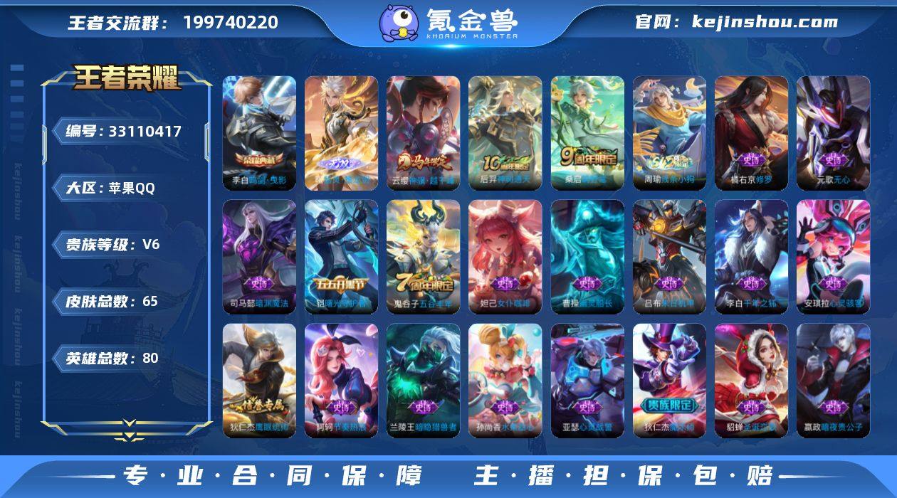 【精氪野王男神号·金标李白·万战李白+李白典藏·1典藏·1无双·3传说·3按键】 苹果Q-V6-最强王者段位-80英雄-65皮肤-1典藏皮肤-1无双-3传说-21史诗 【荣耀典藏】:李白鸣剑曳影 【无双皮肤】:曜器灵螭龙剑 【传说皮肤】:云缨神骥越千峰,后羿神树通天,桑启鸣野蒿 【限定皮肤】:狄仁杰阴阳师,赵云皇家上将,元歌无心,狄仁杰魔术师,项羽海滩派对,李元芳云中旅人,鬼谷子五谷丰年,鲁班大师探海日志,桑启海盐诗旅,艾琳女武神,张良古海寻踪,鬼谷子天穹祈灯 【赛季限定】:李元芳云中旅人,桑启海盐诗旅,鲁班大师探海日志,张良古海寻踪,鬼谷子天穹祈灯,东皇太一噬灭天穹,太乙真人谧流熔炉,亚瑟荣光之誓 【战令限定】:周瑜线条小狗 【史诗皮肤】:周瑜线条小狗,元歌无心,鬼谷子五谷丰年,司马懿暗渊魔法,橘右京修罗,狄仁杰鹰眼统帅,阿轲节奏热浪,铠曙光守护者,安琪拉心灵骇客,亚瑟心灵战警,兰陵王暗隐猎兽者,吕布末日机甲,李白千年之狐,曹操幽灵船长,刘禅绅士熊喵,妲己女仆咖啡,妲己魅力维加斯,嬴政暗夜贵公子,孙尚香水果甜心,狄仁杰魔术师,貂蝉圣诞恋歌,赵云皇家上将 【其他皮肤】:艾琳鹤鸣心笺,亚瑟荣光之誓,太乙真人谧流熔炉,东皇太一噬...